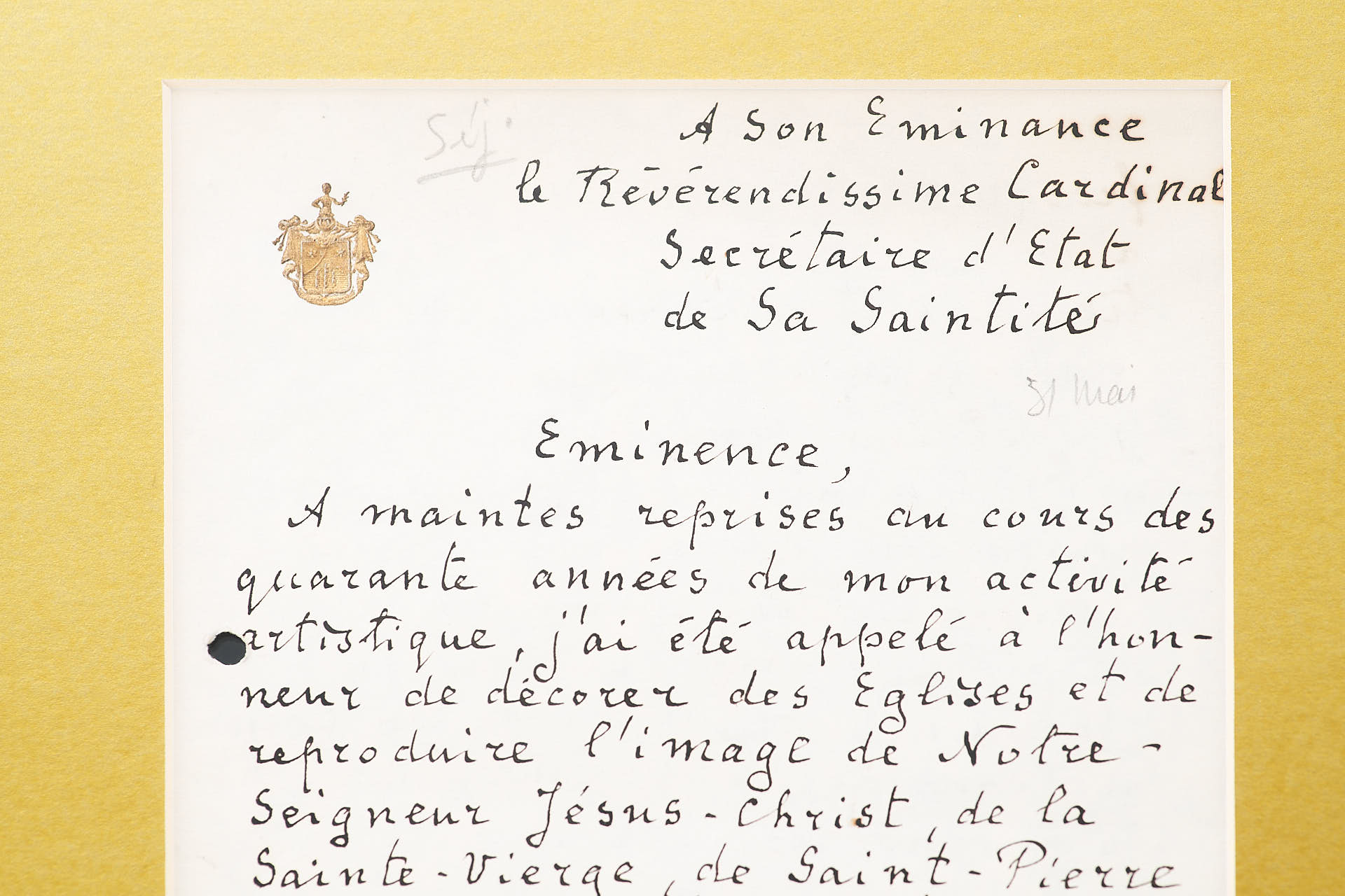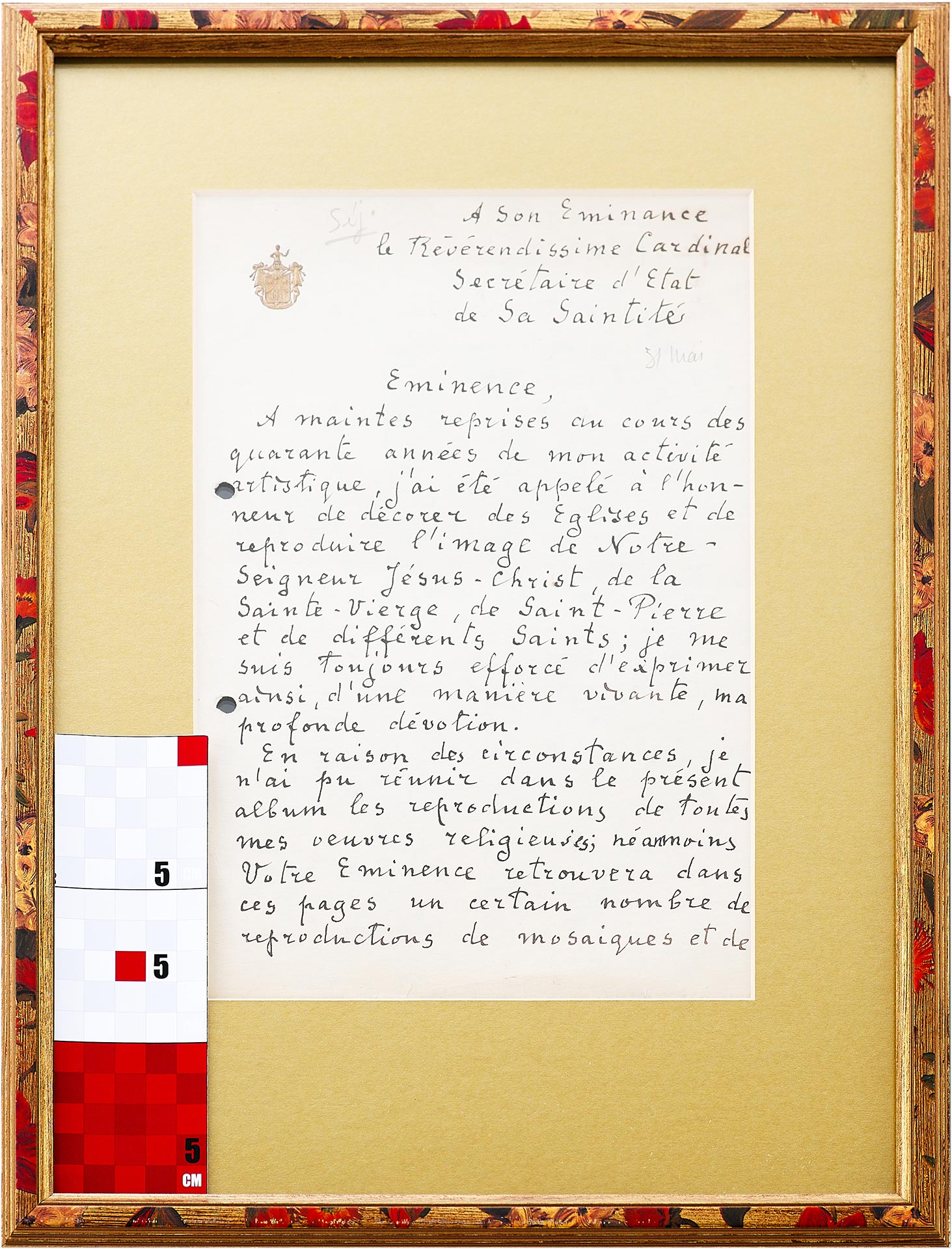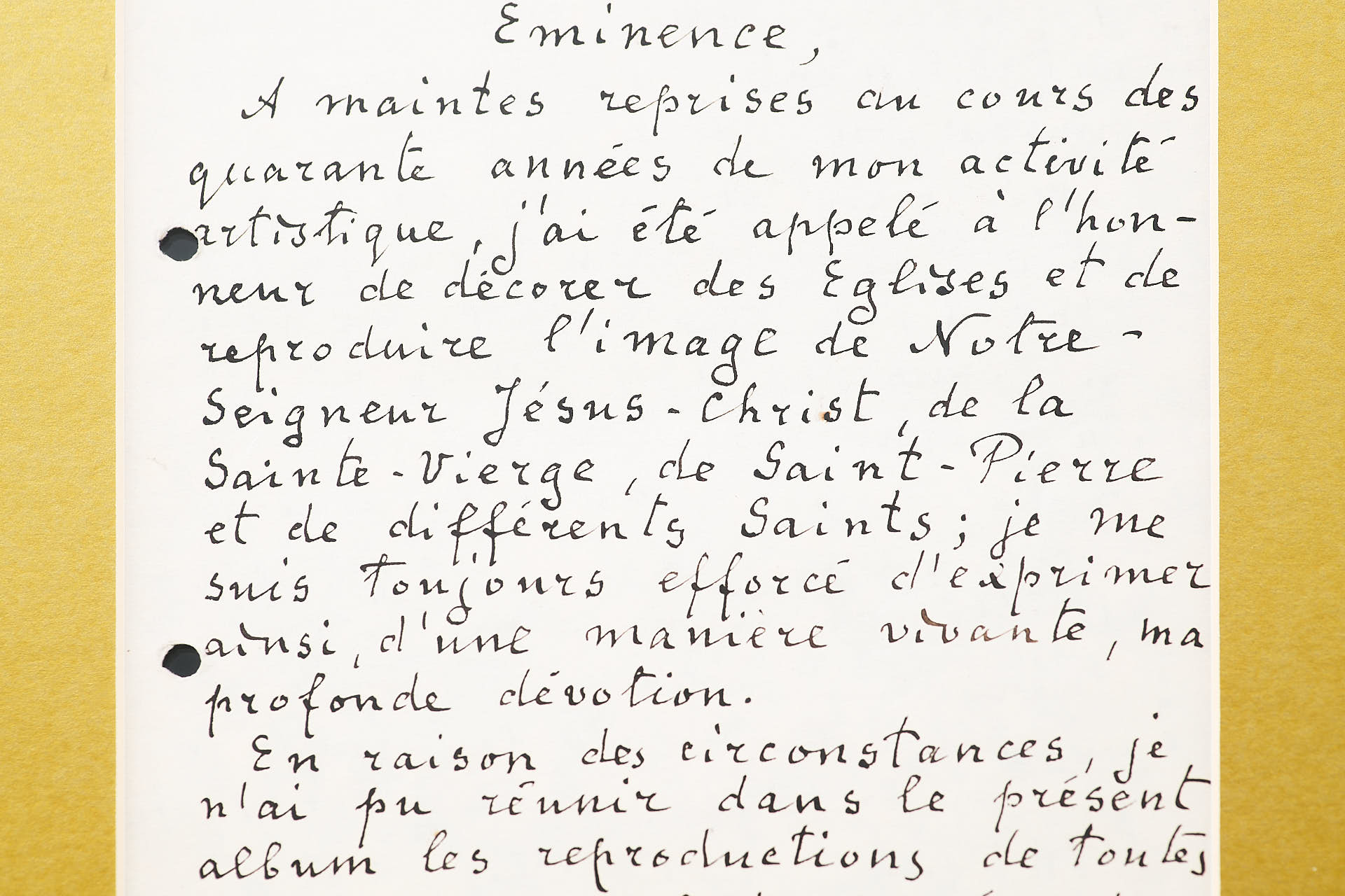 Я считаю, что в настоящее время мы переживаем период исключительной значимости для религии. Именно в духе благочестия и преданности я имею честь просить благословения Вашего Высокопреосвященства. С глубоким уважением прошу Вас принять в дар экземпляр этого альбома, а также передать один экземпляр Его Святейшеству Папе в знак моей глубокой почтительности к Верховному Понтифику. Да ниспошлет мне Ваше Высокопреосвященство память в своих молитвах и да примет уверение глубоком почтении и совершенной преданности.