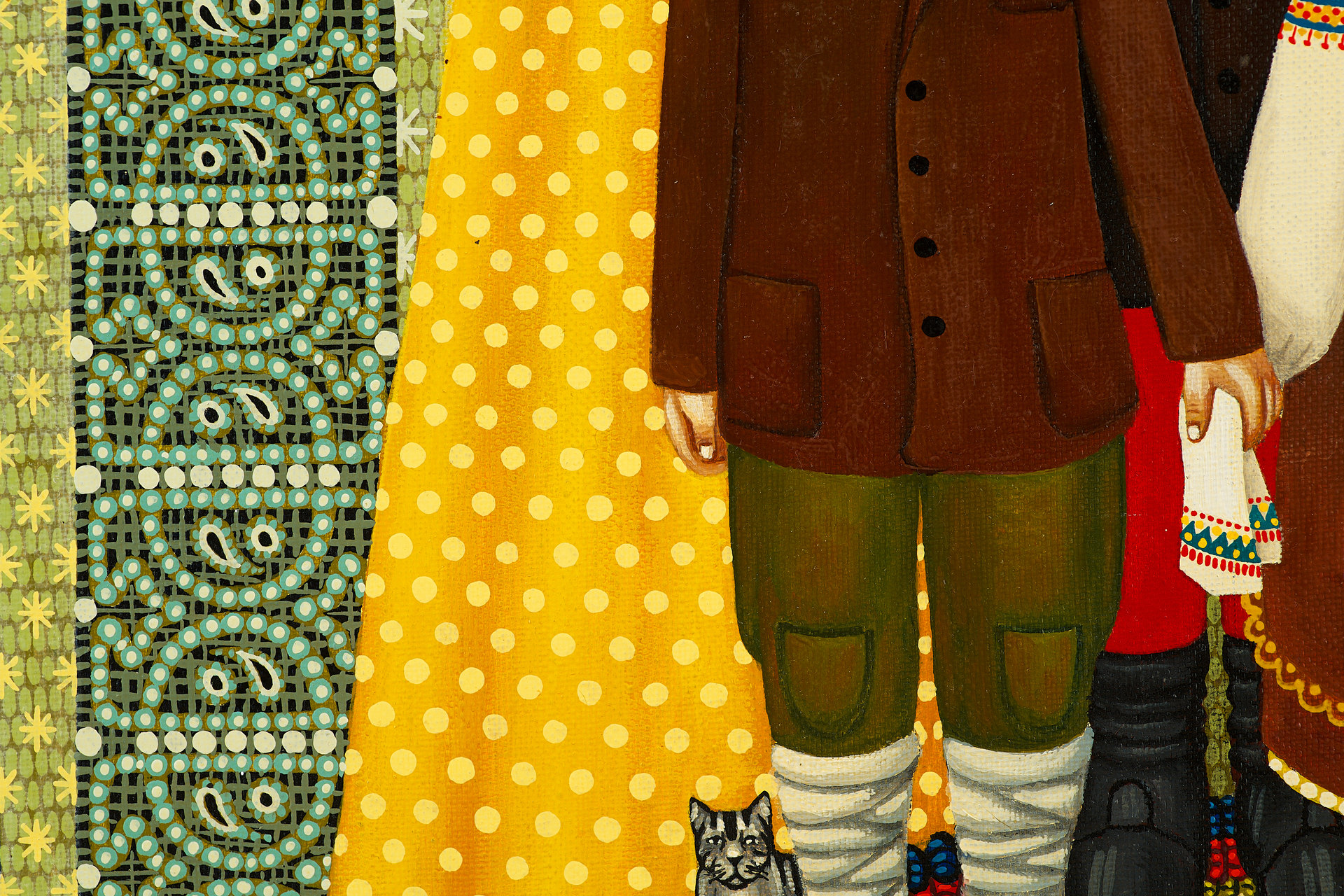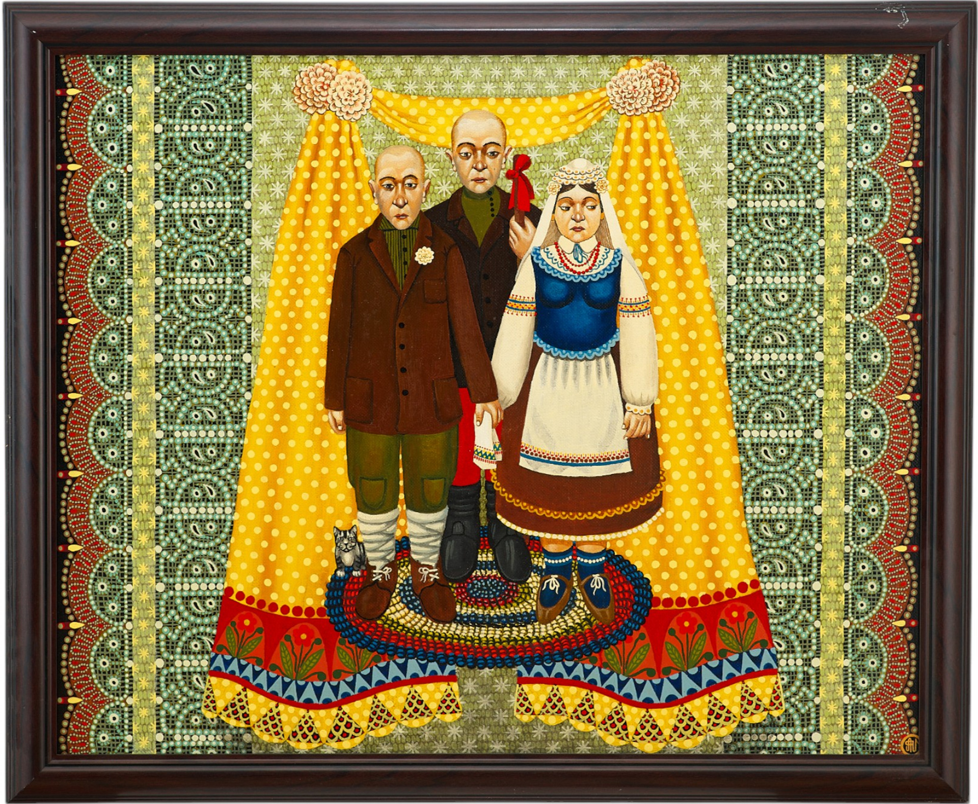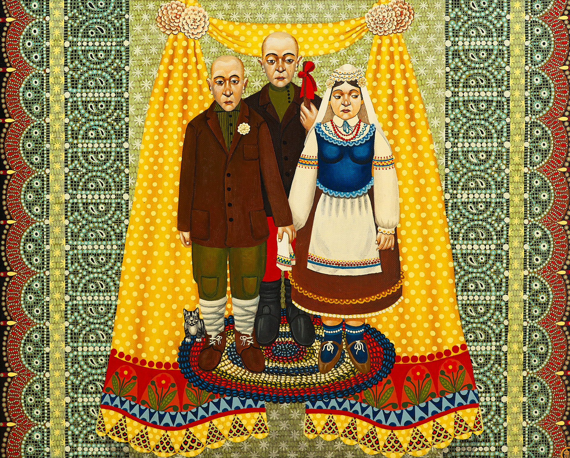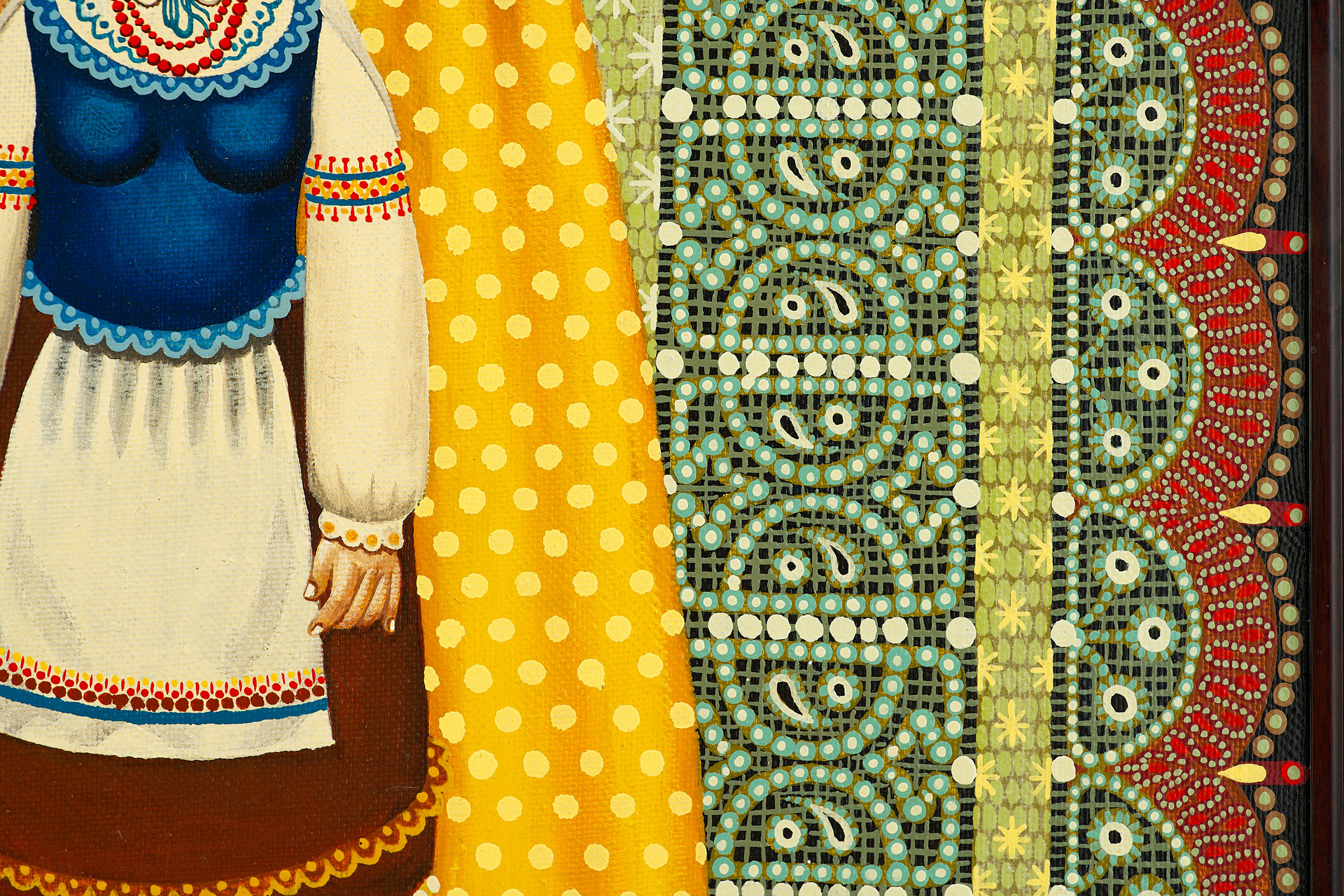 Пространство вокруг героев картины иллюзорное, персонажи словно застыли внутри живописного орнамента, выполненного в сложной авторской технике. Художник часто на своих работах пользуется приемом заполнения плоскости, это сплошное орнаментальное панно, сплетенное на коклюшках.