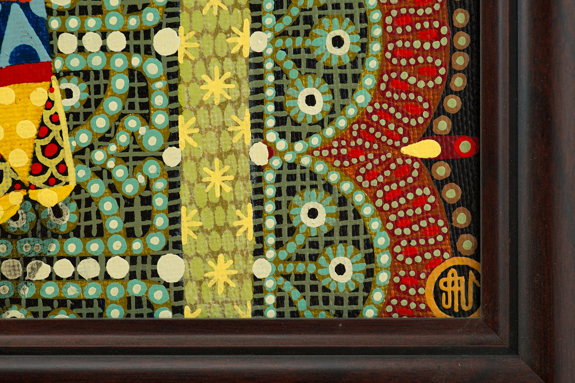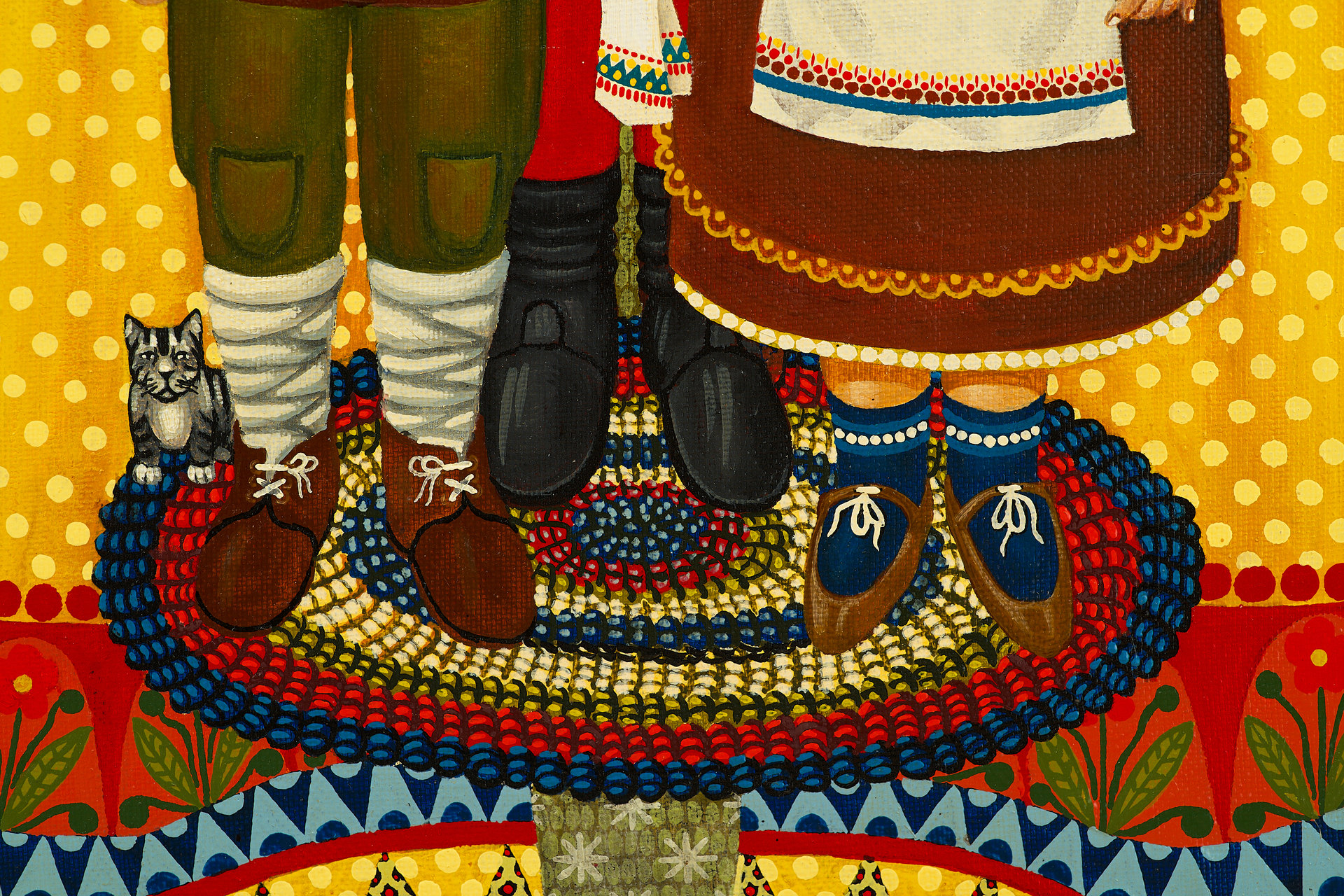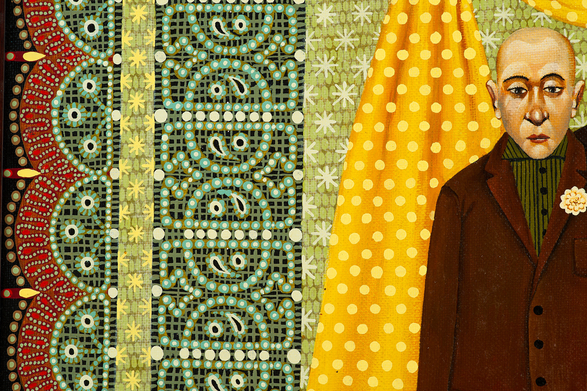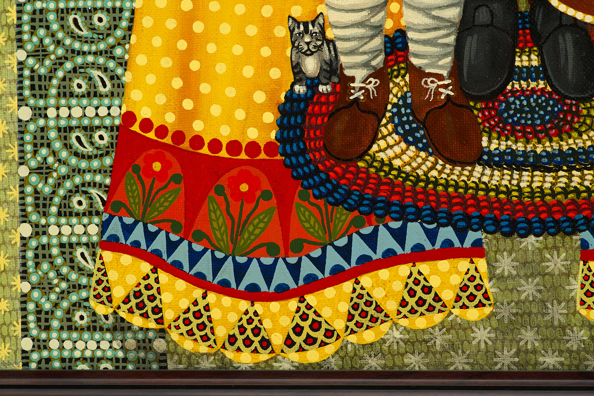 Пространство вокруг героев картины иллюзорное, персонажи словно застыли внутри живописного орнамента, выполненного в сложной авторской технике. Художник часто на своих работах пользуется приемом заполнения плоскости, это сплошное орнаментальное панно, сплетенное на коклюшках.