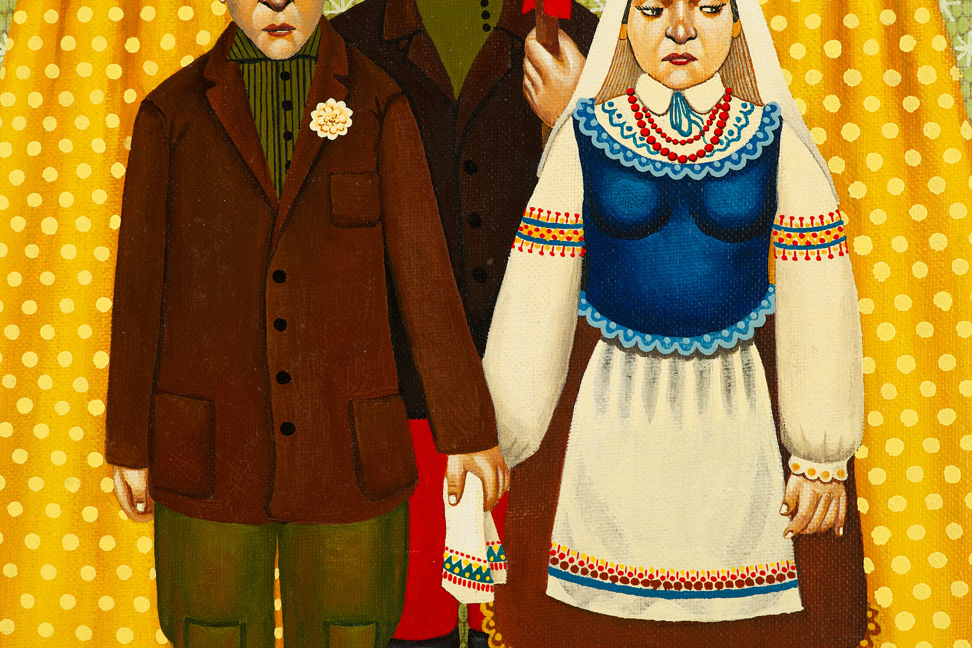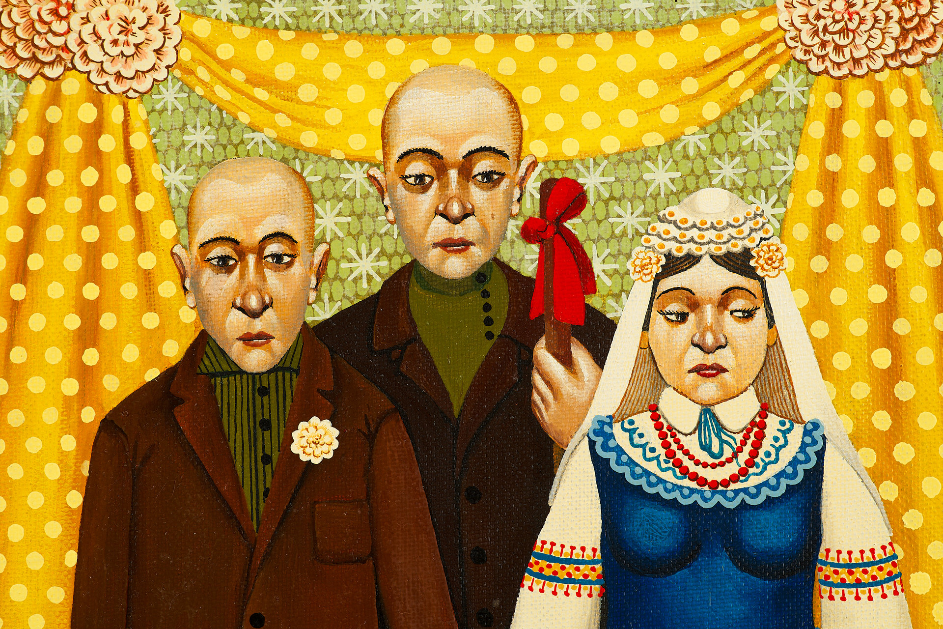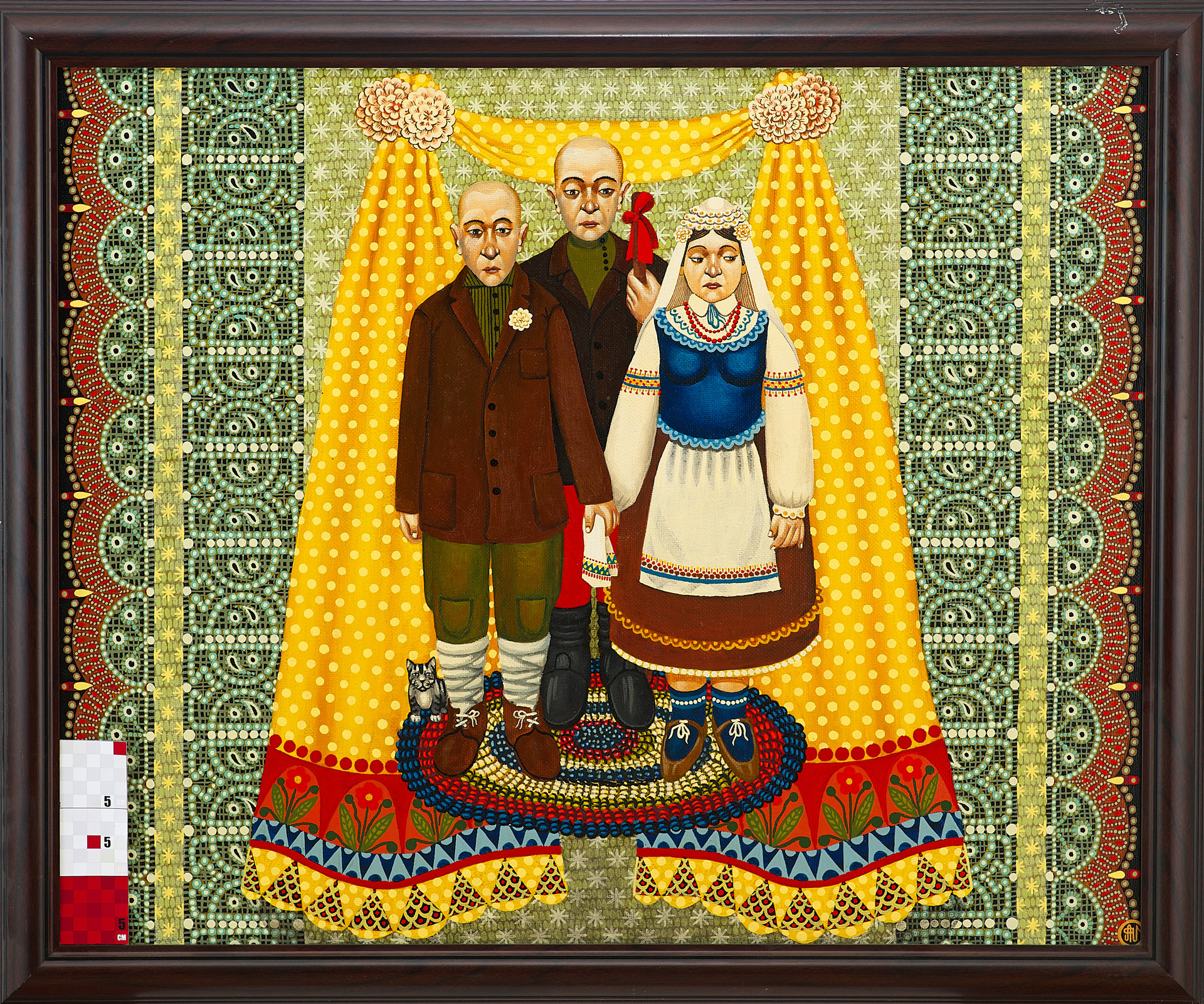 На представленной работе изображена сцена свадебного обряда. На первом плане жених и невеста в псевдоэтнических костюмах. За ними сват, который держит посох с красным бантом. Группа стоит на вязаном деревенском половике - круге, под праздничным золотистым пологом с вышивкой.