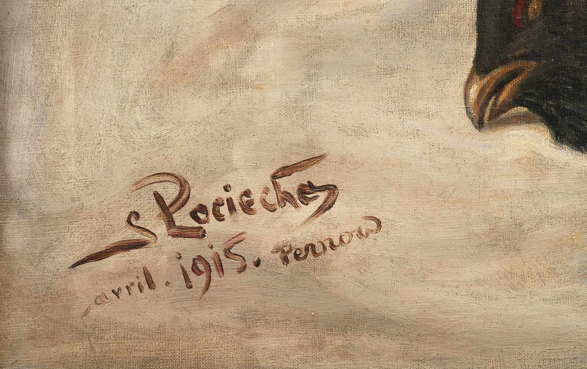 В правом нижнем углу подпись и дата коричневой масляной краской того же колера, что иавторская живопись: S. Pociecha avril. 1915. Pernow