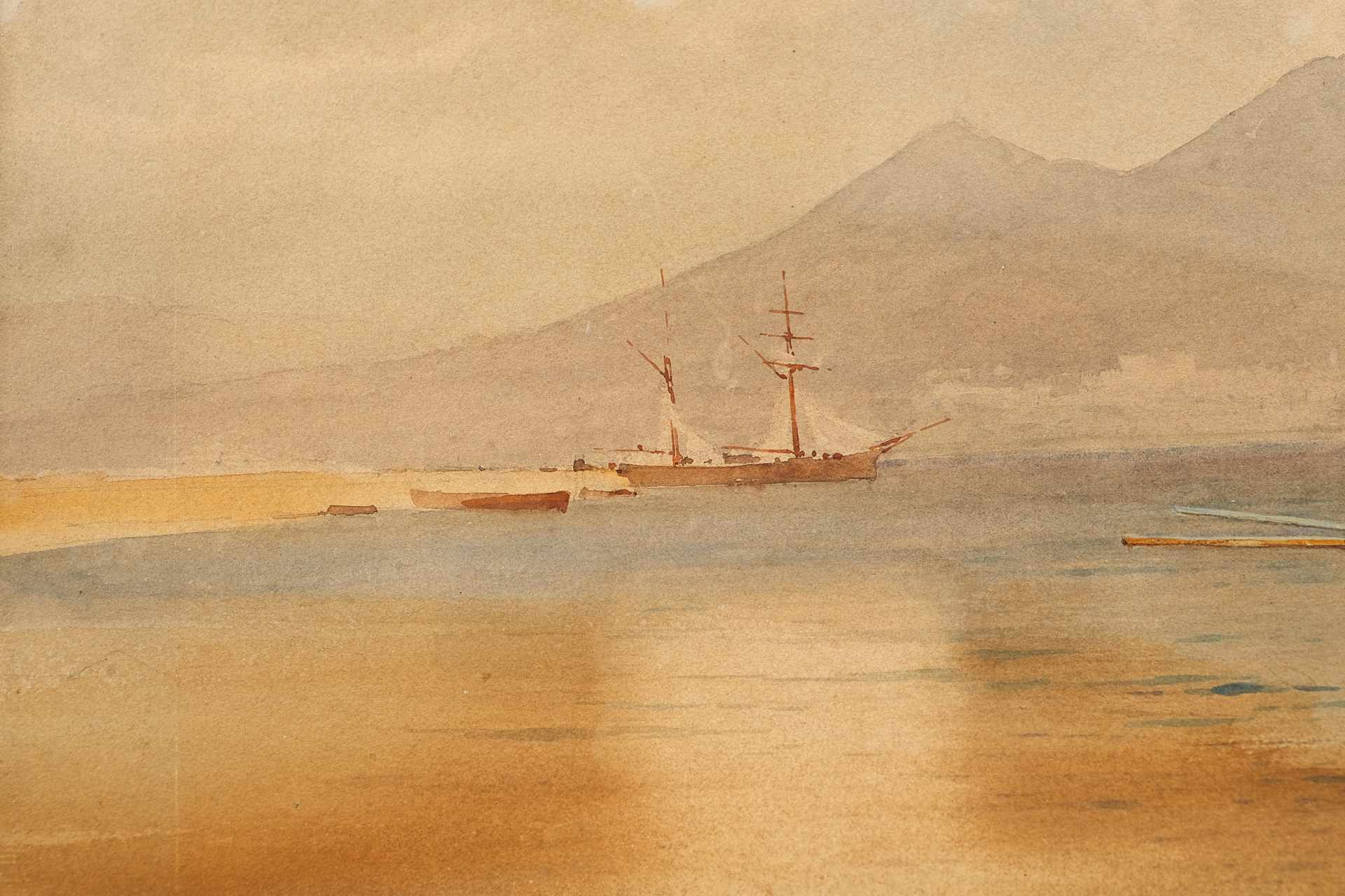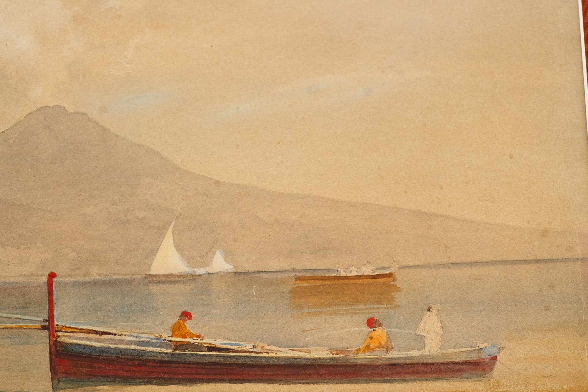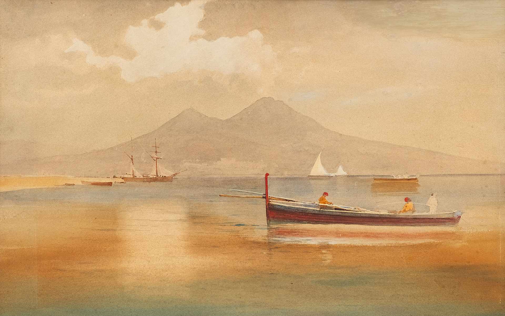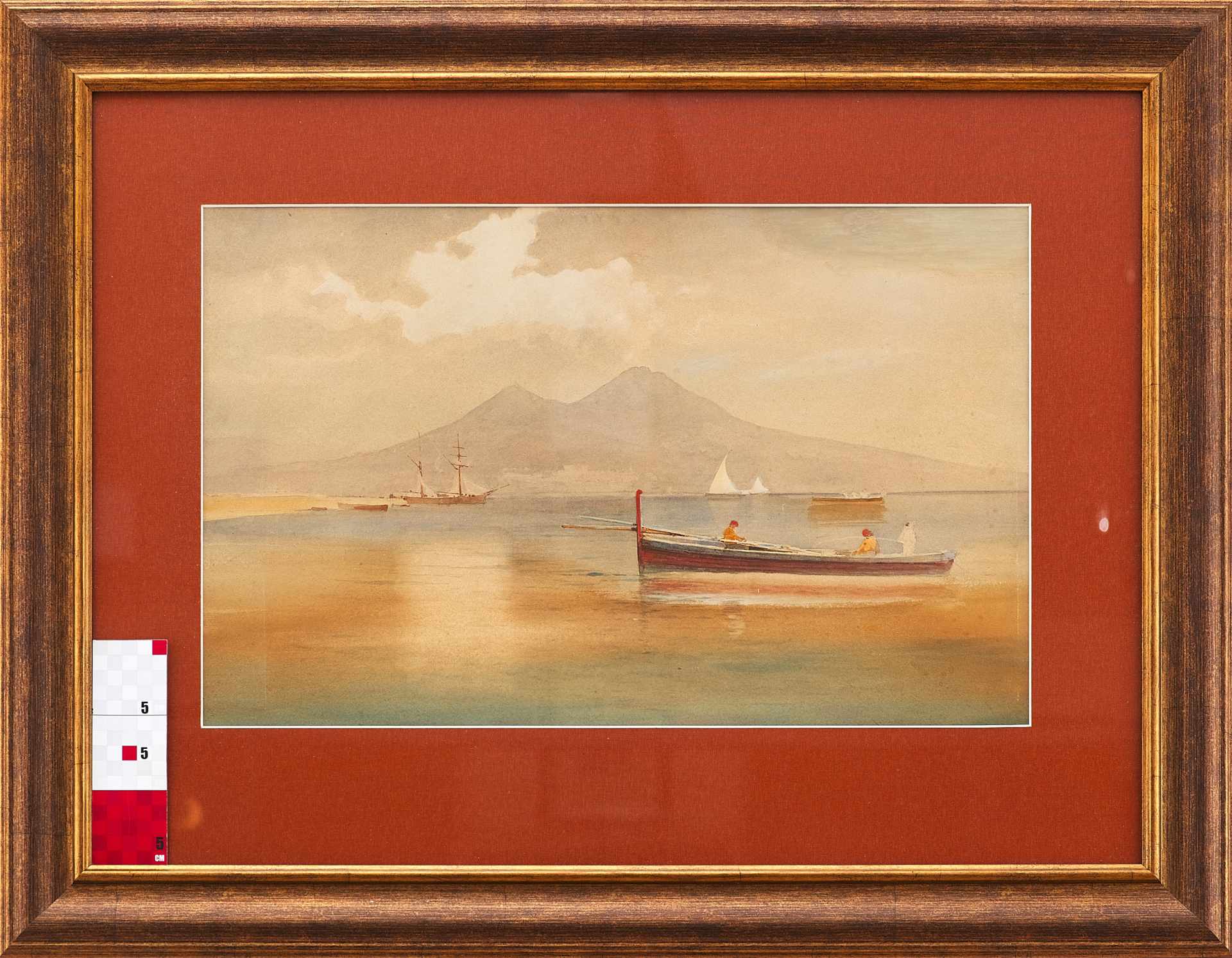 На картине изображен морской пейзаж. На водной поверхности широкой коричневой полосой отражаются горы и небо, затянутое облаками. Справа рыбацкая лодка, на горизонте видны парусники. На обратной стороне картона чернилами надпись: “Н. Прокофьевъ”; справа вверху “Анна И. Гессенъ”. Произведение находилось в собрании семьи Гессен.