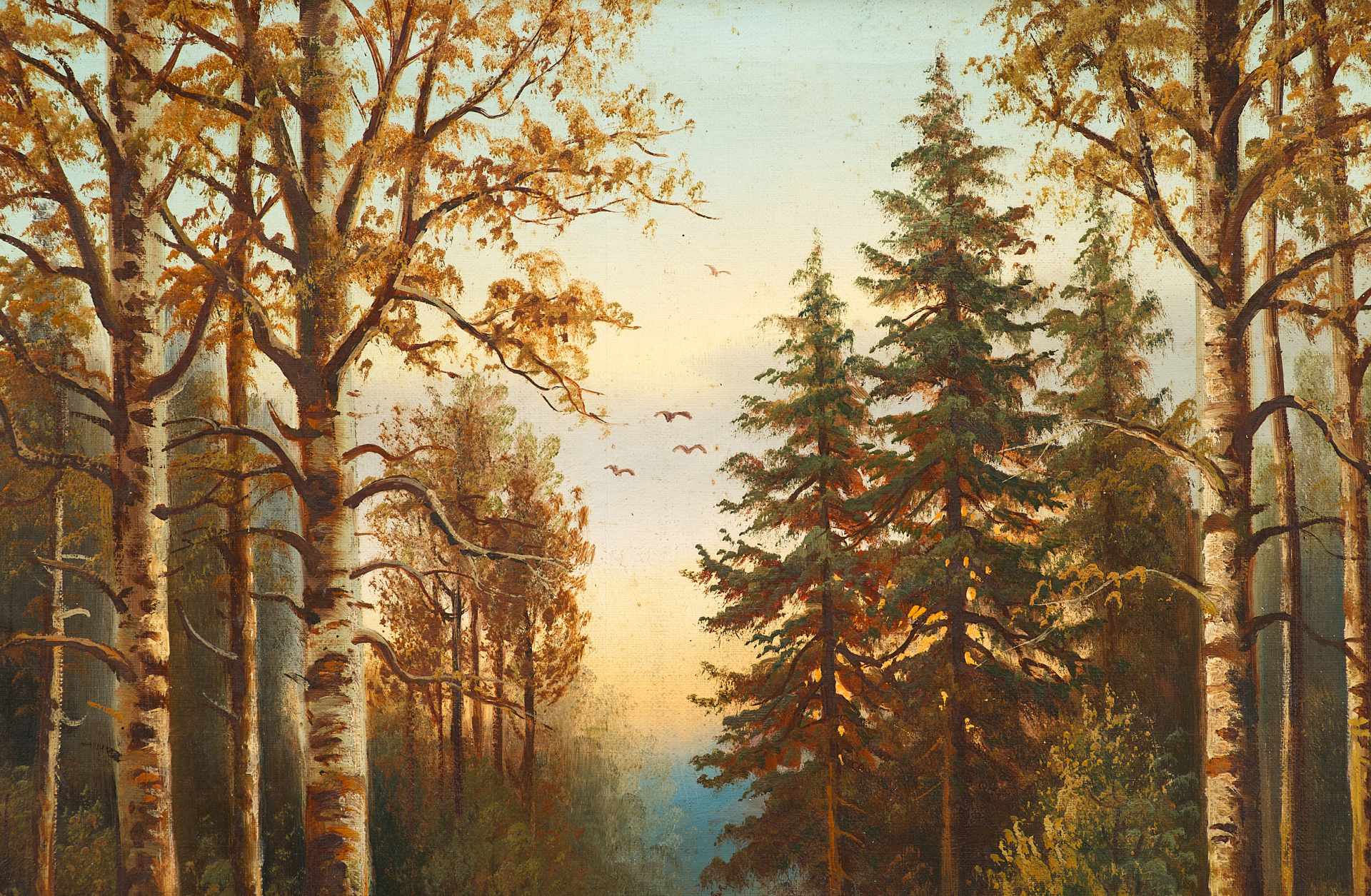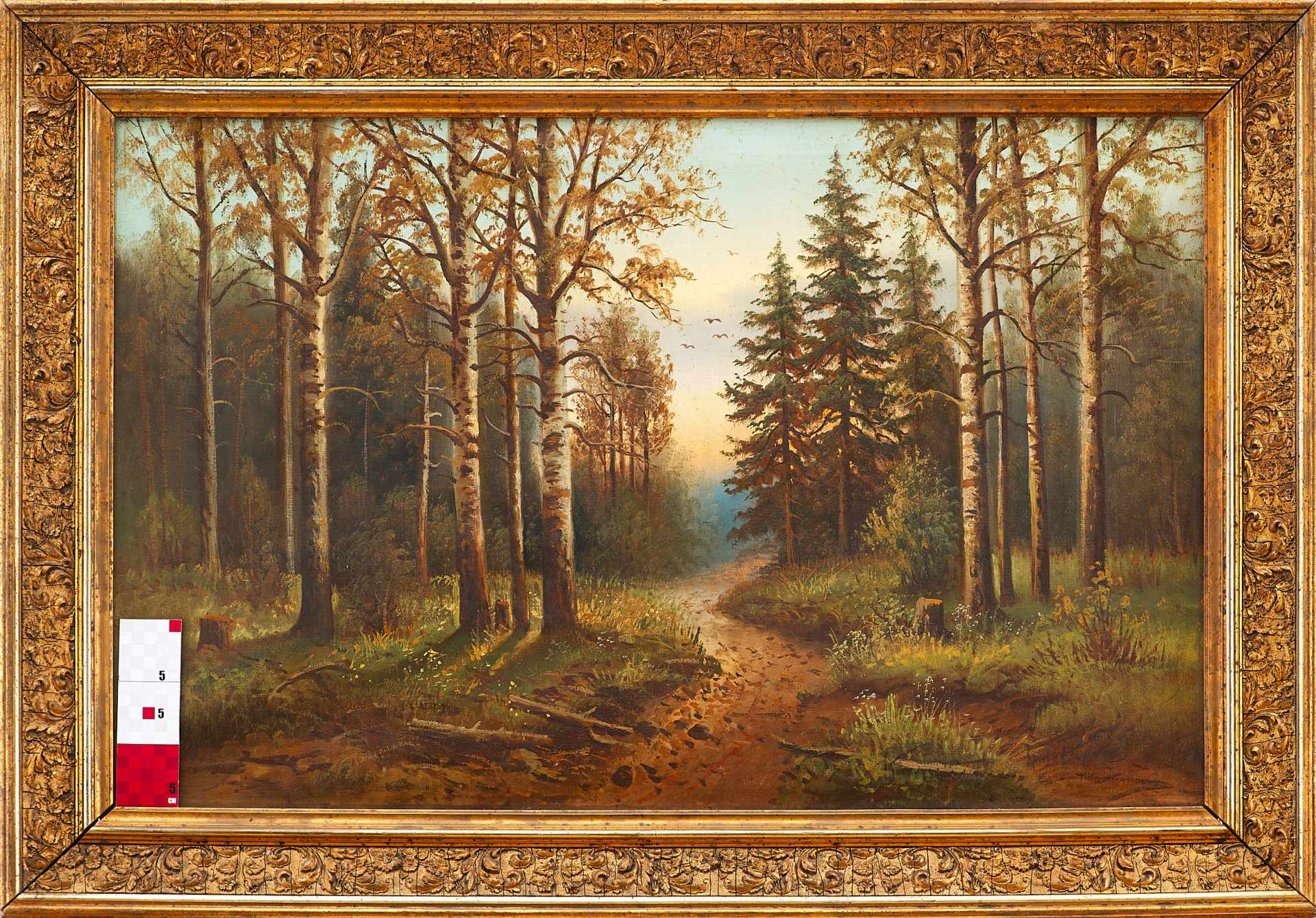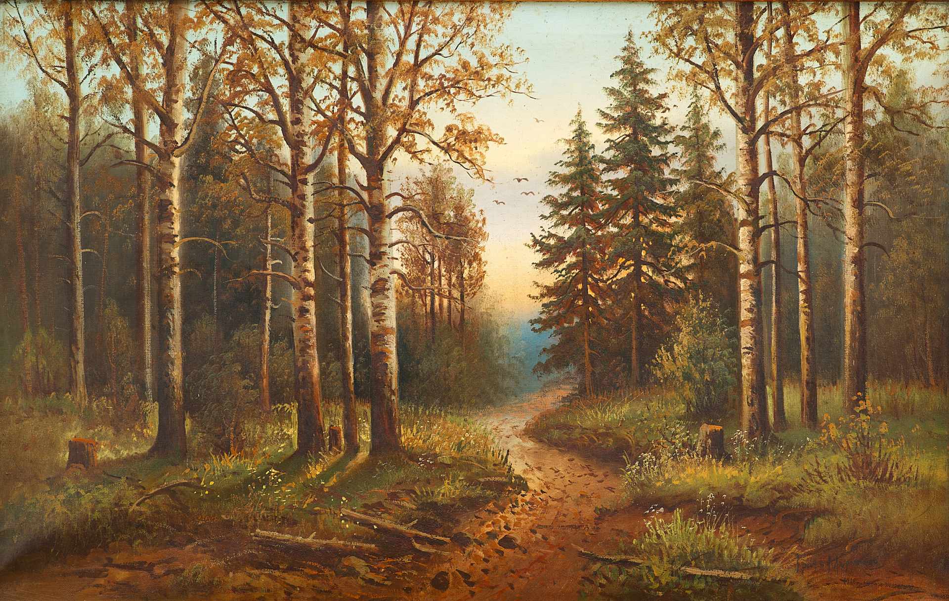 На картине изображен осенний лес. Сквозь высокие деревья проглядывает зеленое небо с летящими птицами. На переднем плане извилистая тропинка, по обеим сторонам которой стройные березы с осенней листвой. В правом нижнем углу имеется авторская подпись и дата: “Граф Муравьевъ. 1910.”
