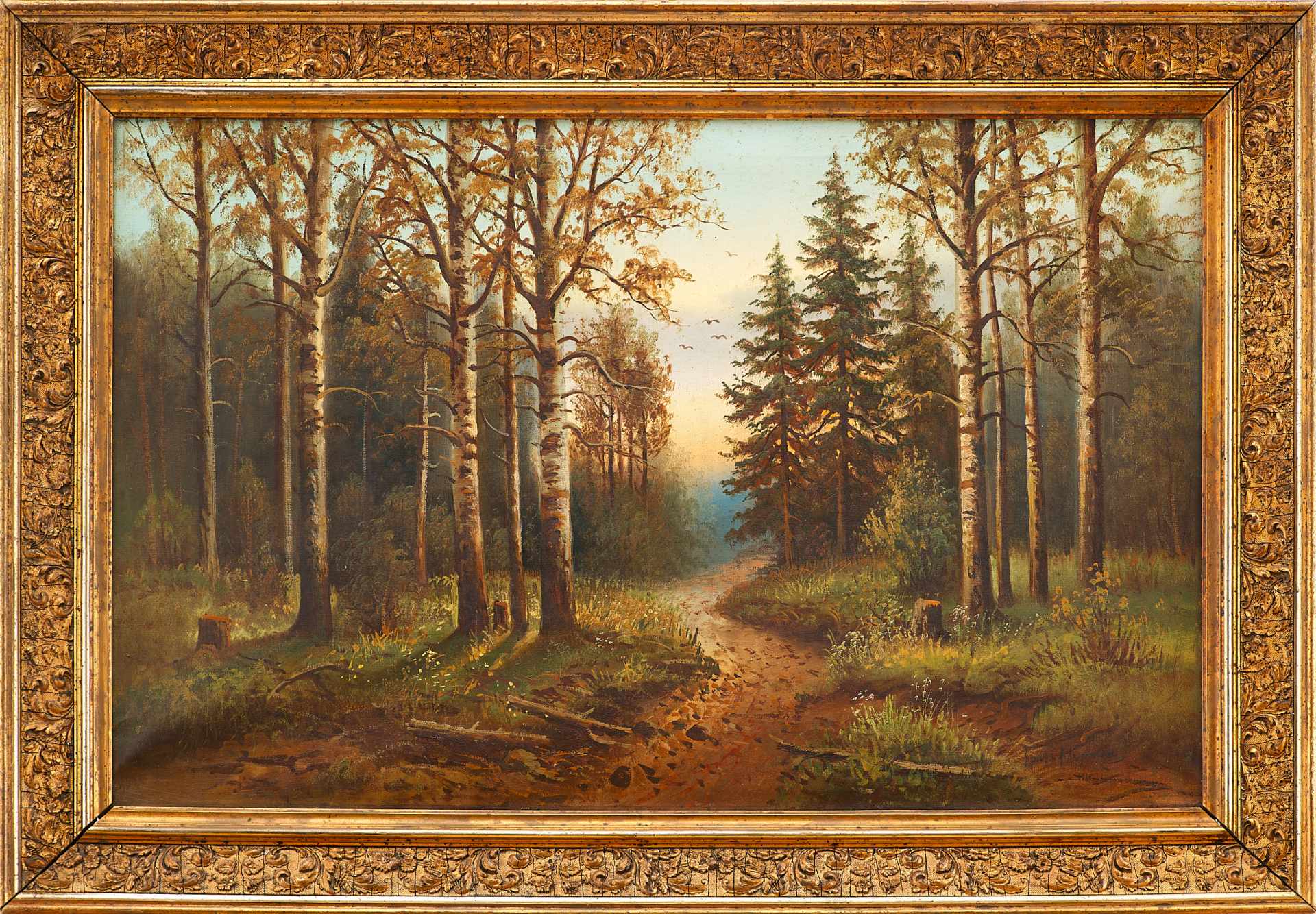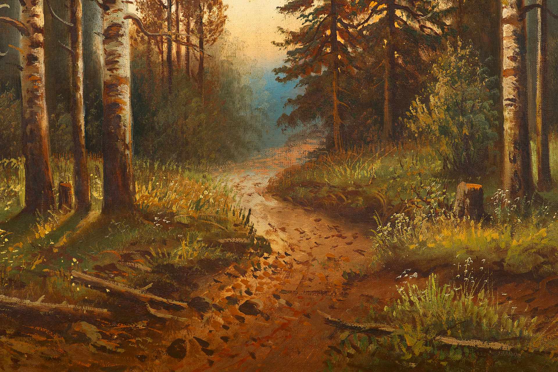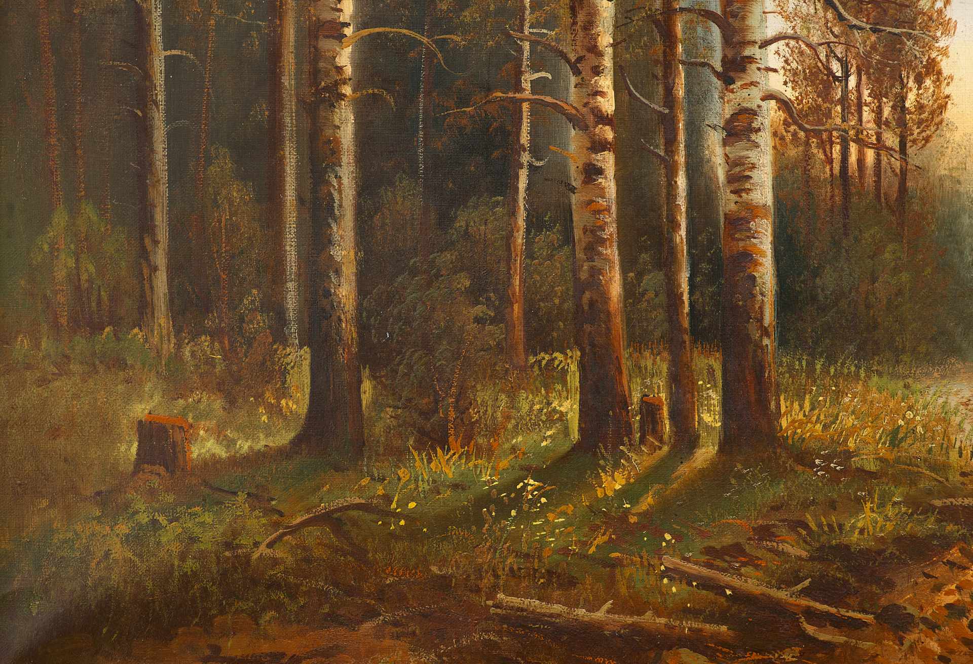 На картине изображен осенний лес. Сквозь высокие деревья проглядывает зеленое небо с летящими птицами. На переднем плане извилистая тропинка, по обеим сторонам которой стройные березы с осенней листвой. В правом нижнем углу имеется авторская подпись и дата: “Граф Муравьевъ. 1910.”