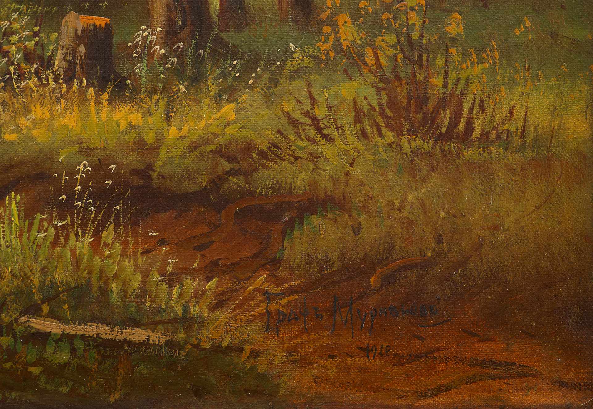 Подпись не вызывает сомнений в подлинности. Она идентична эталонным автографам В.Муравьёва и частично лежит под старыми мазками. Дата 1910 соответствует старению холста и живописных материалов. На основании подлинности подписи, времени создания, характера изобразительного мотива, сходства стилистического, технологического с эталонами,