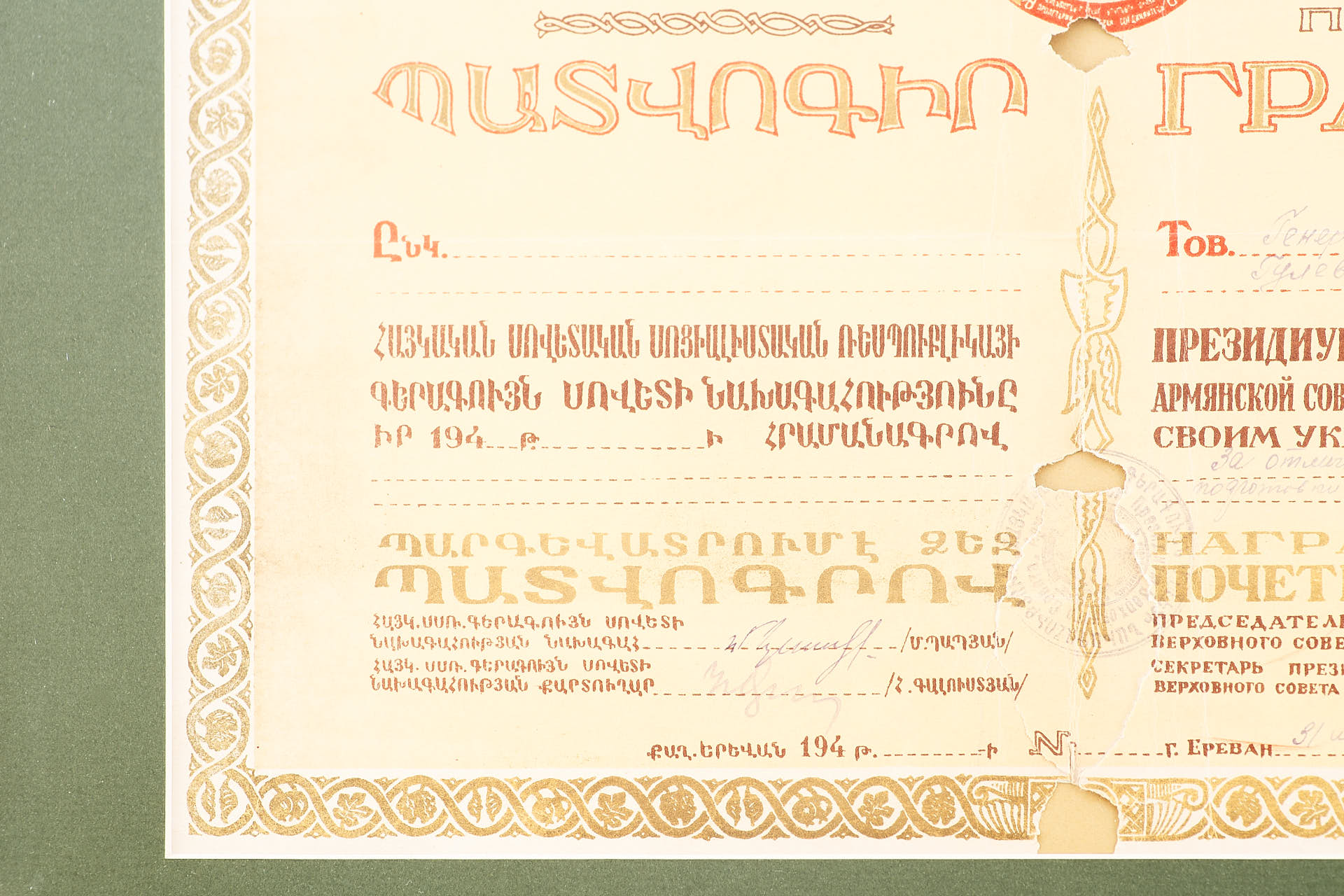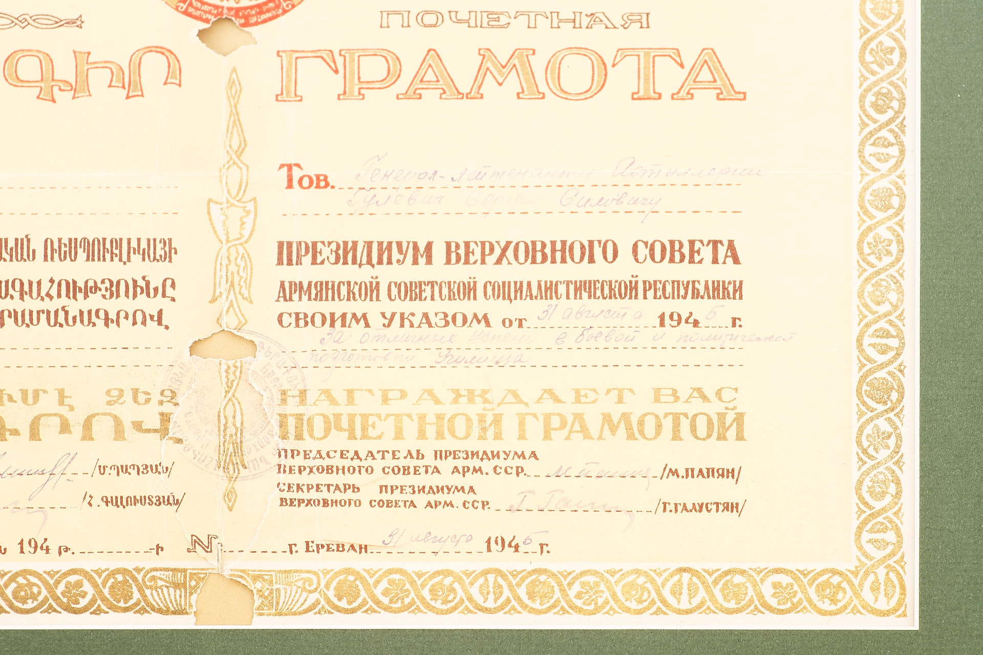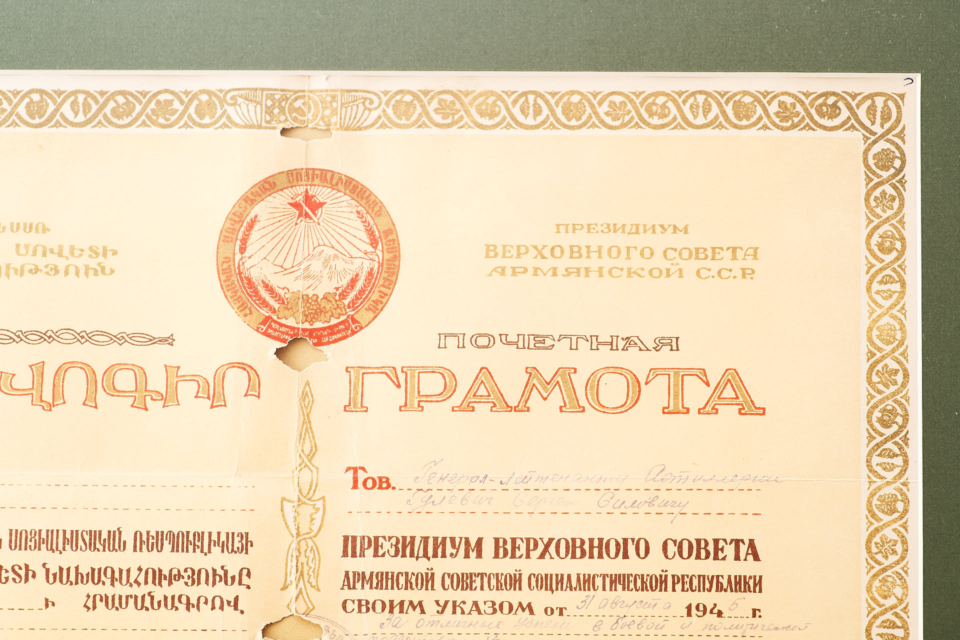 почетная грамота генерал-лейтенанту Гулевичу Сергею Силовичу, врученная от Президиума Верховного Совета АССР за отличные успехи в боевой и политической подготовке училища. Дата приказа и вручения грамоты - 31 авгу ста 1945 г. Текст грамоты выполнен на армянском и русском языках.