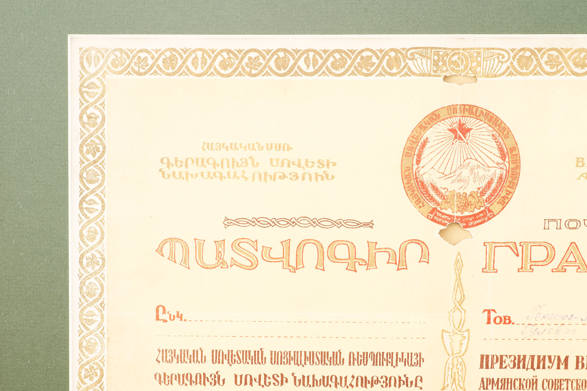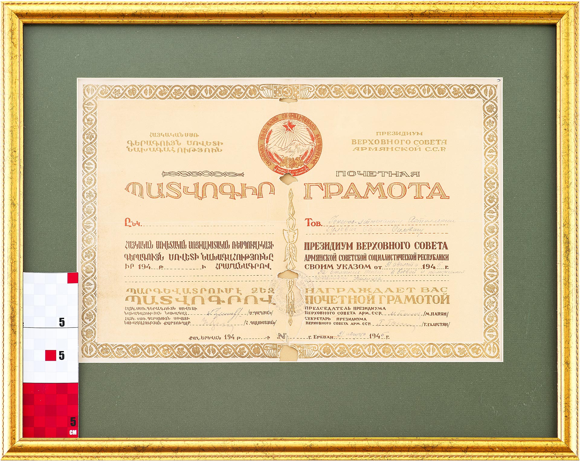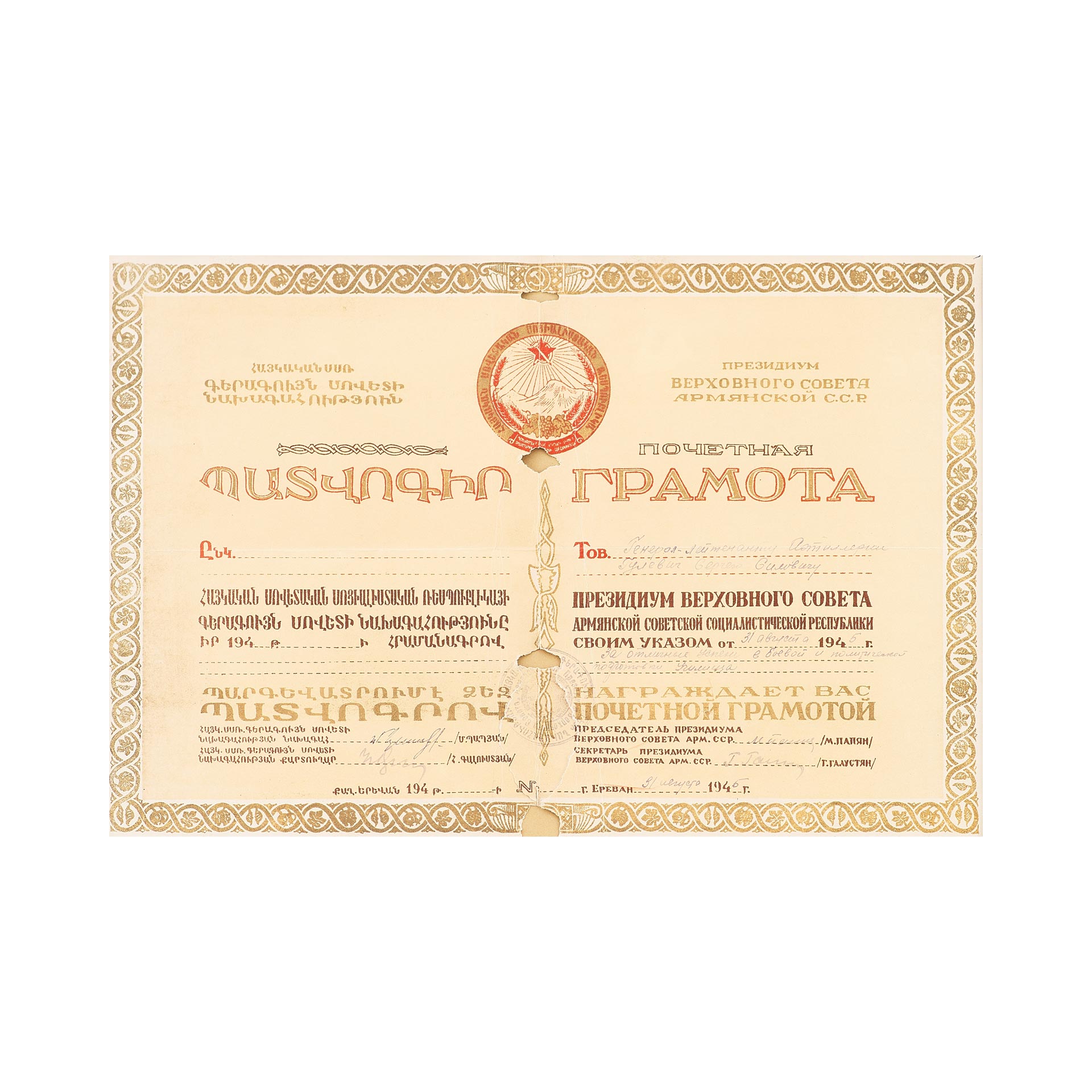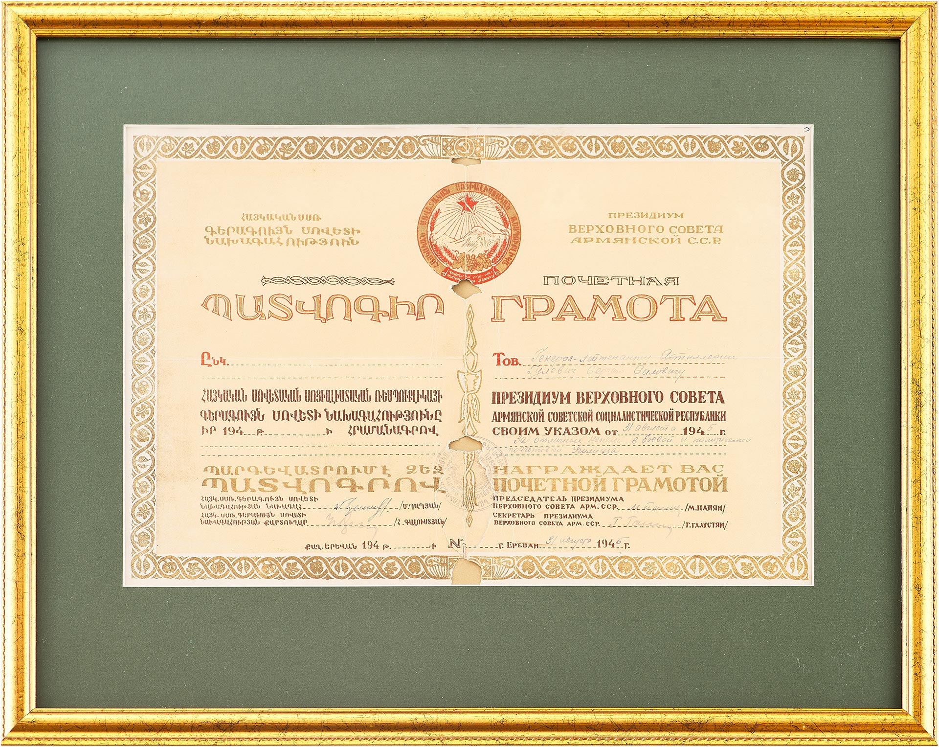 почетная грамота генерал-лейтенанту Гулевичу Сергею Силовичу, врученная от Президиума Верховного Совета АССР за отличные успехи в боевой и политической подготовке училища. Дата приказа и вручения грамоты - 31 авгу ста 1945 г. Текст грамоты выполнен на армянском и русском языках.