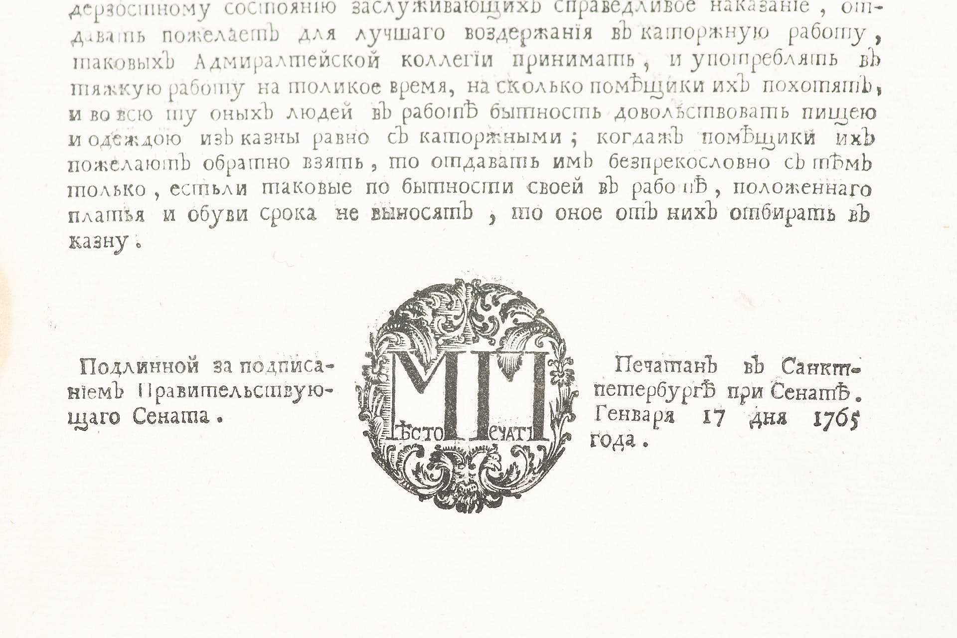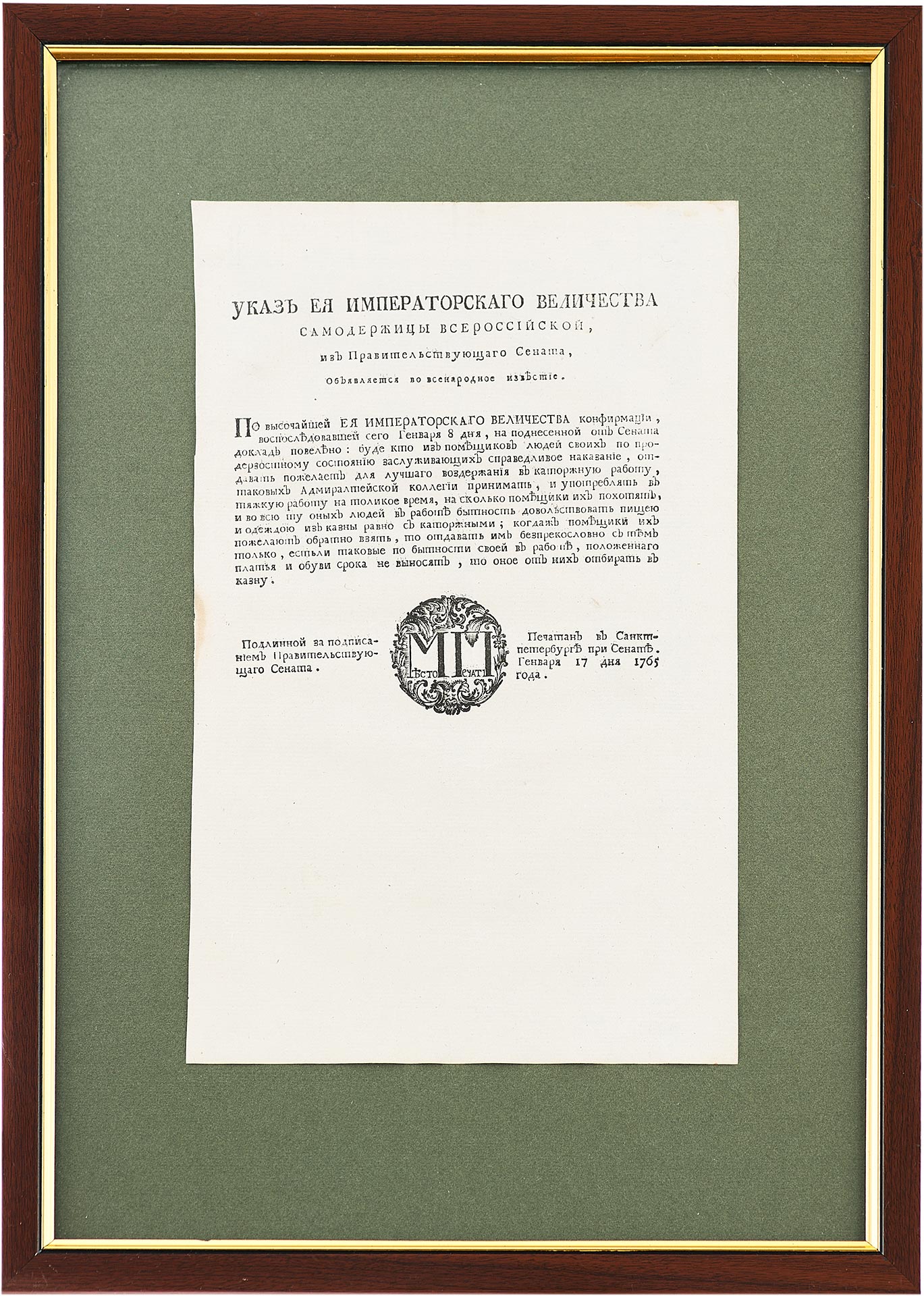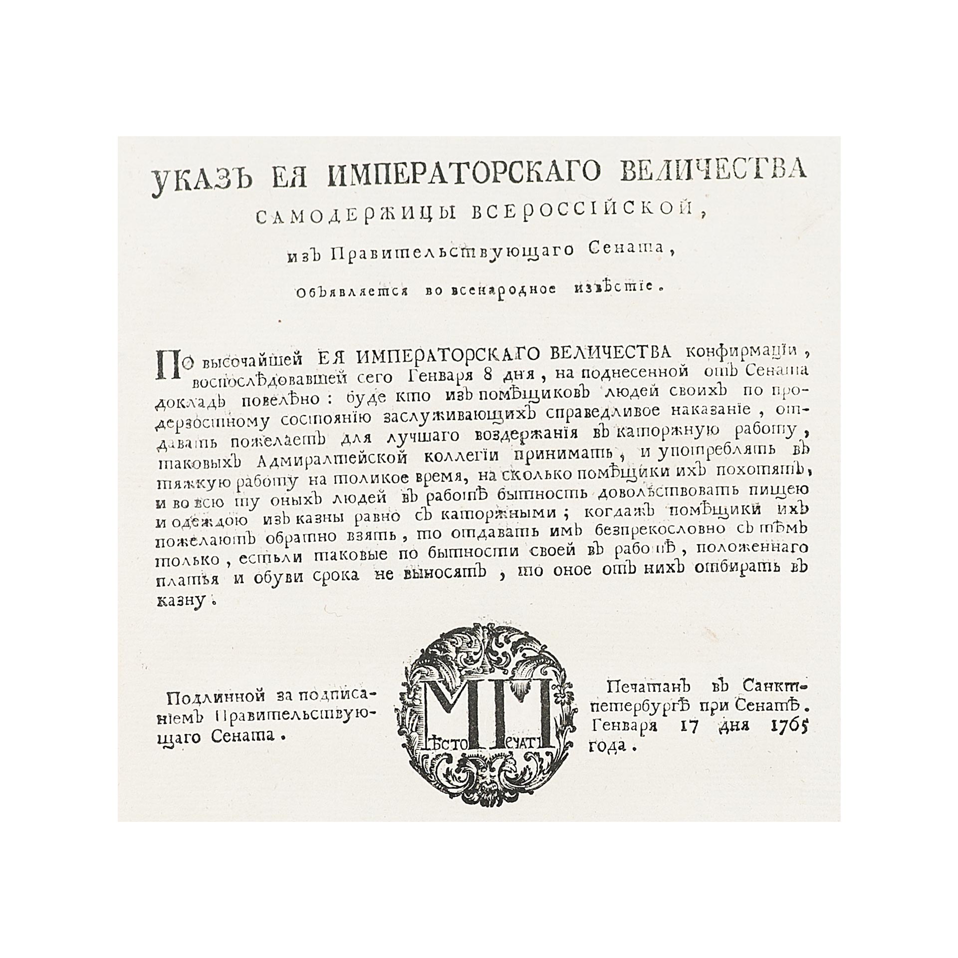 Представлен листок, отпечатанный по случаю объявления указа от 17 января 1765 г. российской императрицы Екатерины II «О приемеАдмиралтейской коллегии присылаемых от помещиков для смирения крепостныхлюдей, и обупотреблении их в тяжкуюработу». Екатерины II, которая, желая прослыть просвещенным человеком, успела немало сделать для пенитенциарной системы. Важным моментом в этом вопросе стал Указ от 17 января 1765 года «О приеме адмиралтейской коллегии присылаемых от помещиков для смирения крепостных людей и обупотреблении их в тяжелую работу'», по которому «буде кто из помещиков люде своих по продерзостному состоянию заслуживающих справедливое наказание, отдавать пожелает доя лучшего воздержания в каторжную работу, гаковьгх Адмиралтейской Коллегии принимать и употреблять в