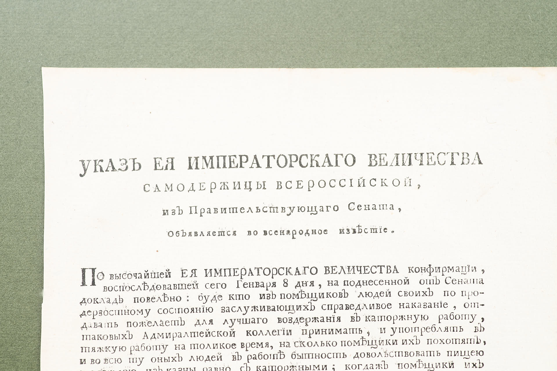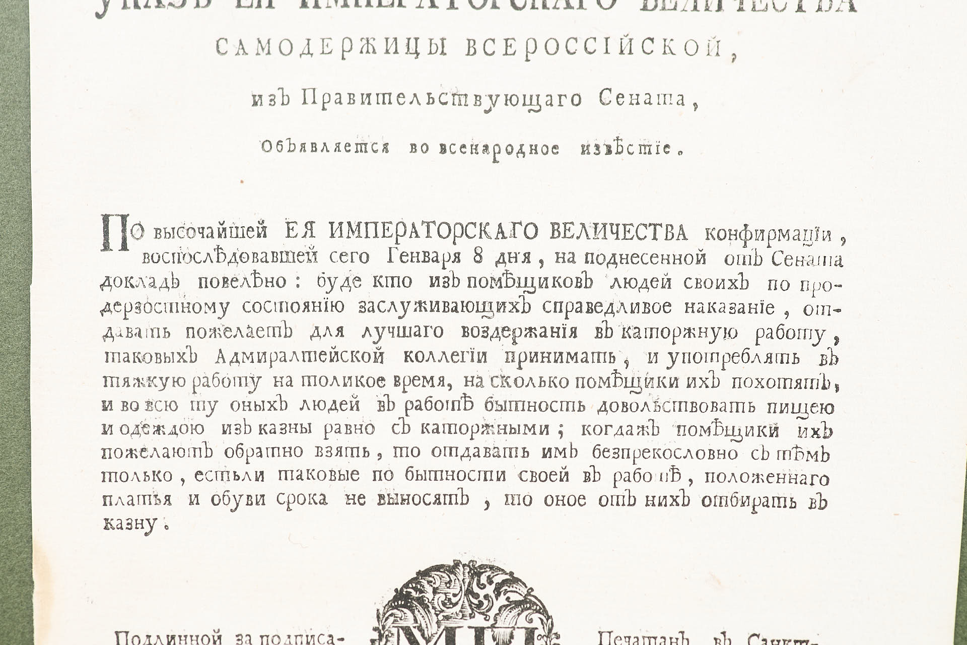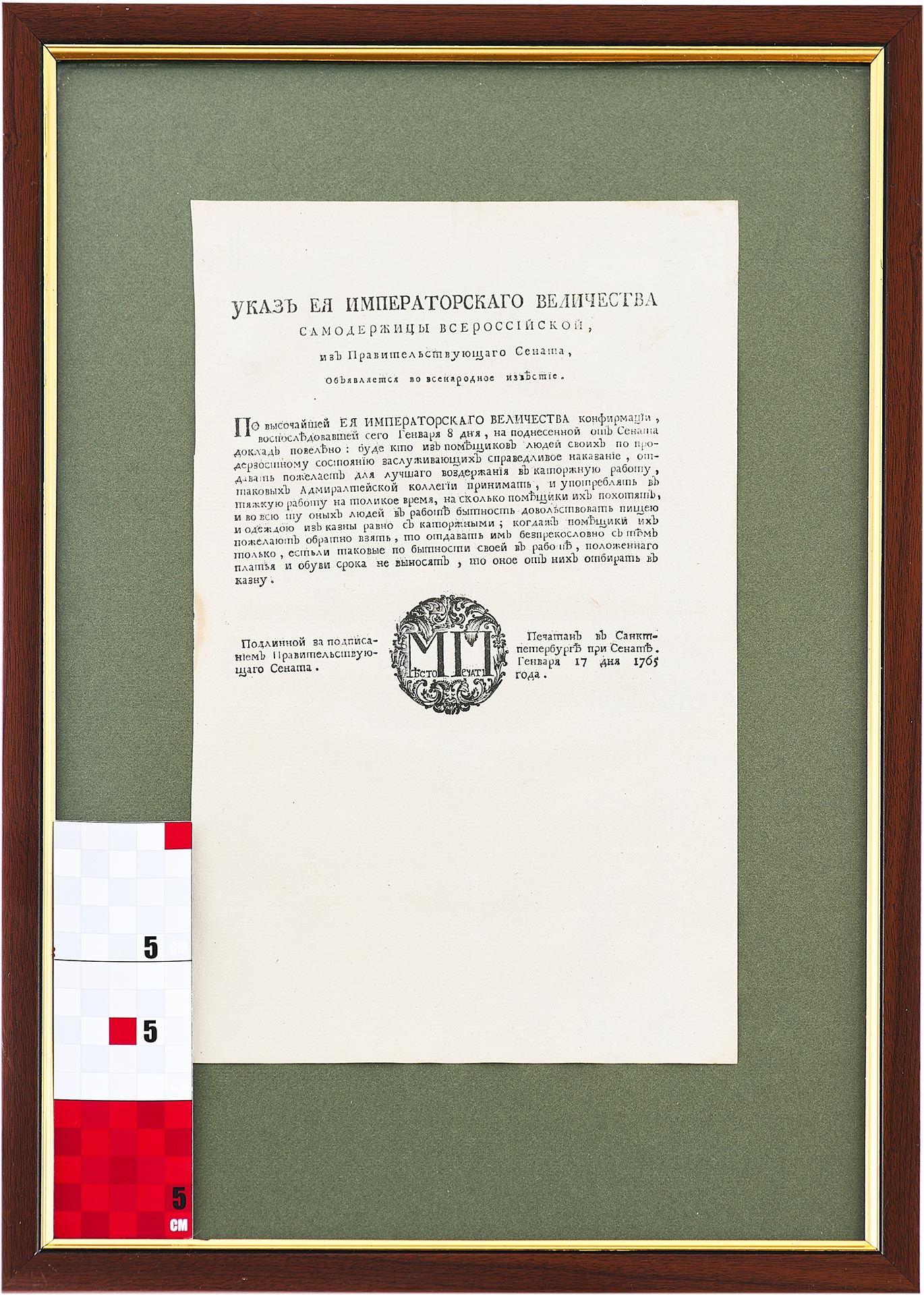 Представлен листок, отпечатанный по случаю объявления указа от 17 января 1765 г. российской императрицы Екатерины II «О приемеАдмиралтейской коллегии присылаемых от помещиков для смирения крепостныхлюдей, и обупотреблении их в тяжкуюработу». Екатерины II, которая, желая прослыть просвещенным человеком, успела немало сделать для пенитенциарной системы. Важным моментом в этом вопросе стал Указ от 17 января 1765 года «О приеме адмиралтейской коллегии присылаемых от помещиков для смирения крепостных людей и обупотреблении их в тяжелую работу'», по которому «буде кто из помещиков люде своих по продерзостному состоянию заслуживающих справедливое наказание, отдавать пожелает доя лучшего воздержания в каторжную работу, гаковьгх Адмиралтейской Коллегии принимать и употреблять в
