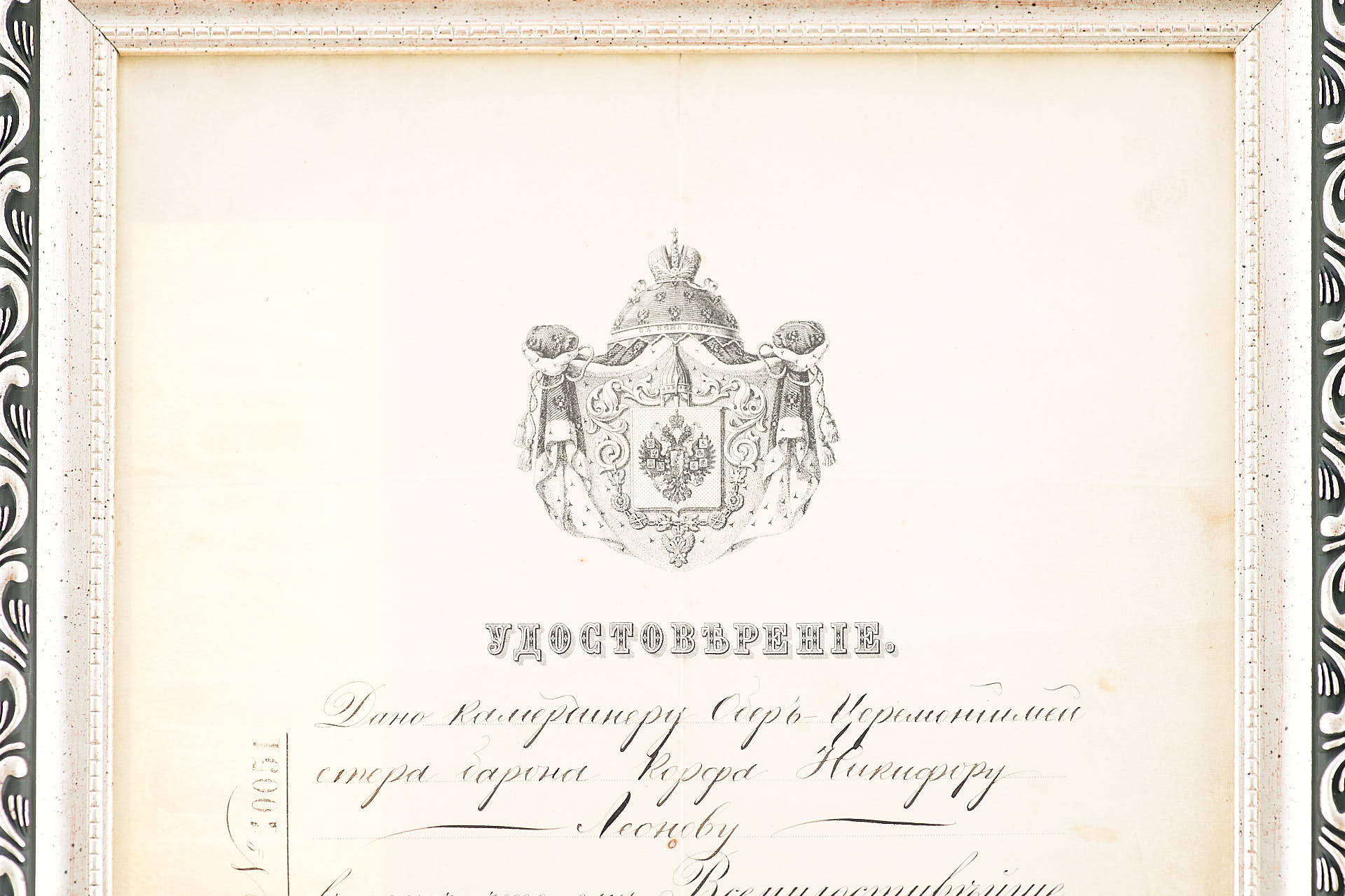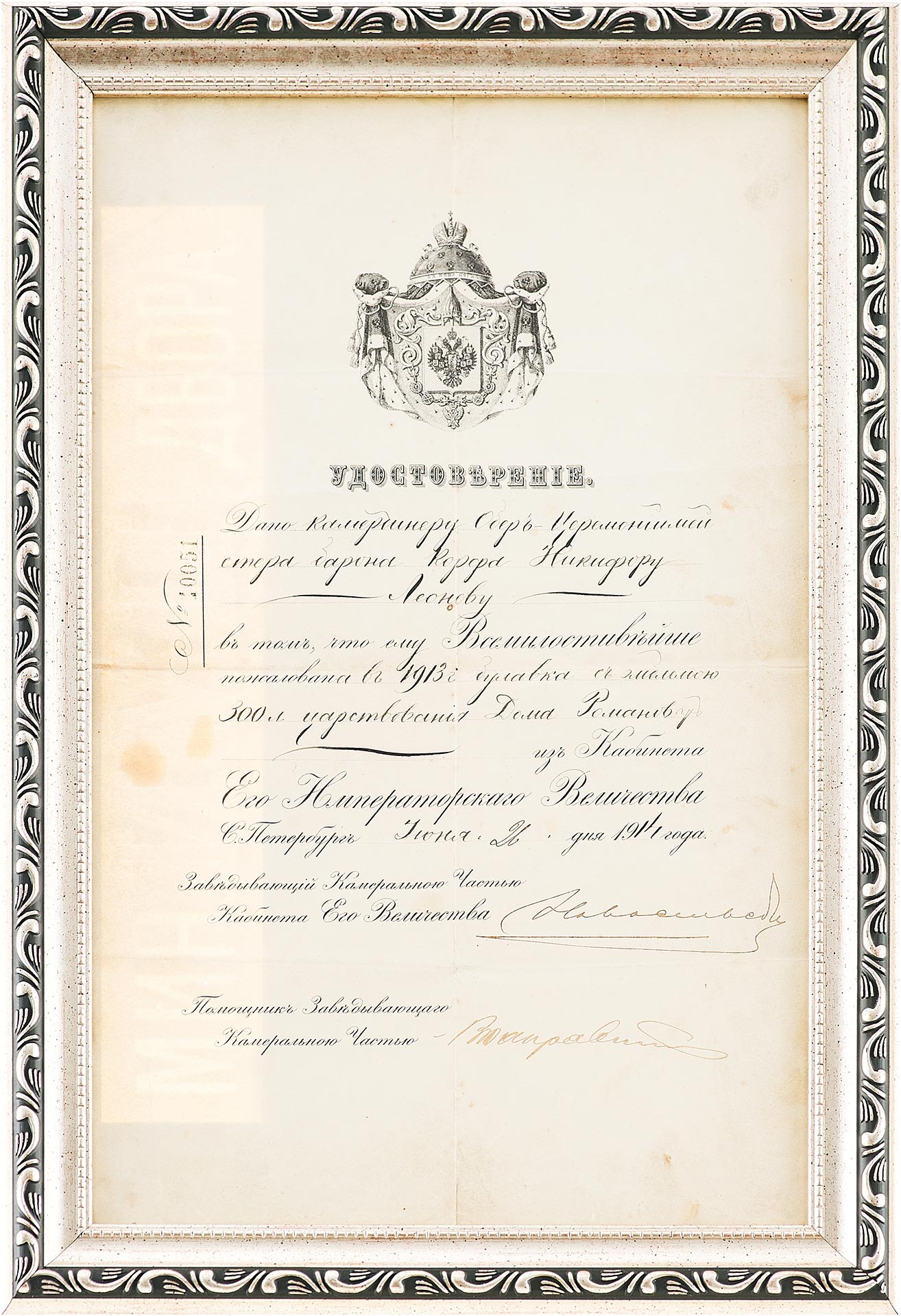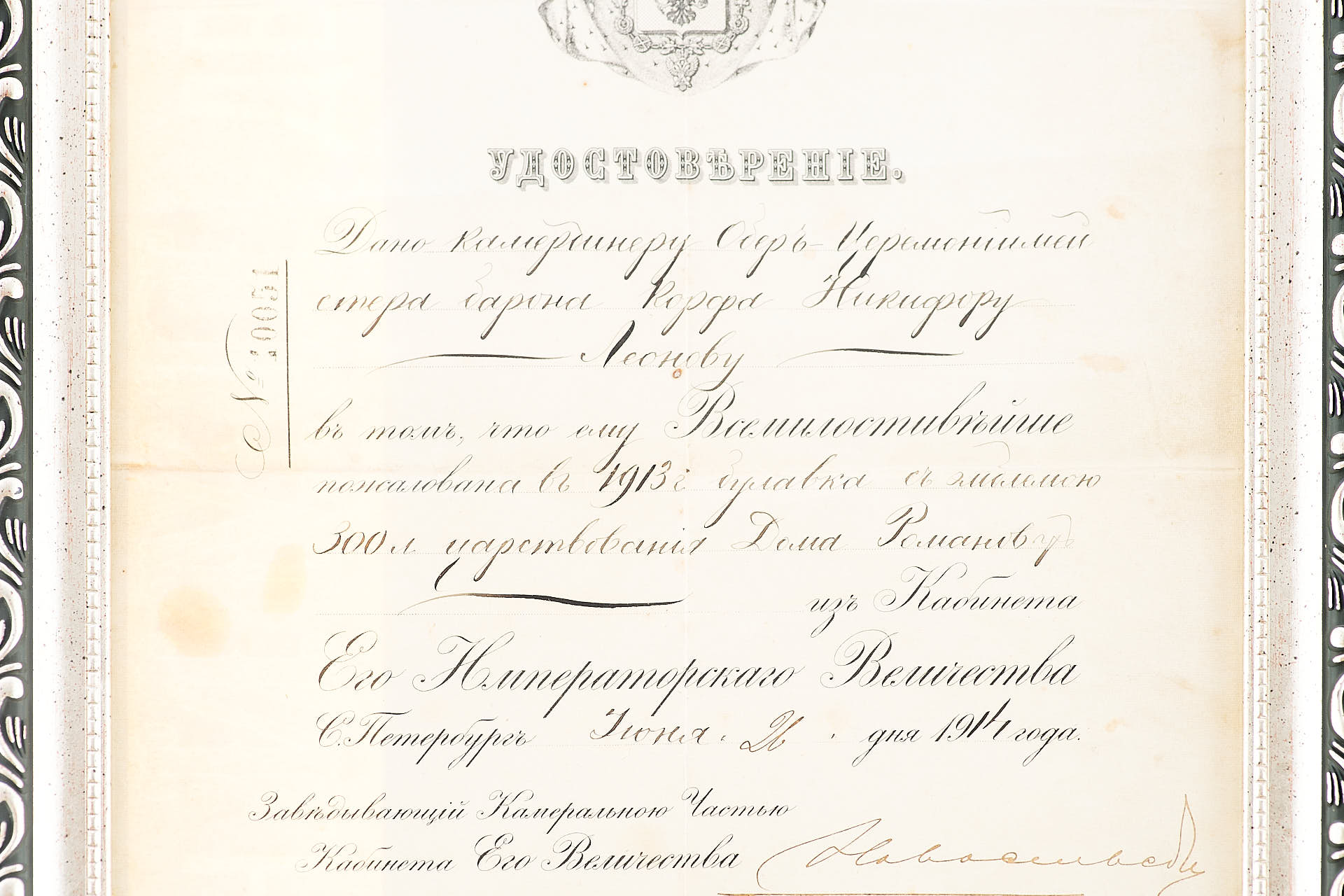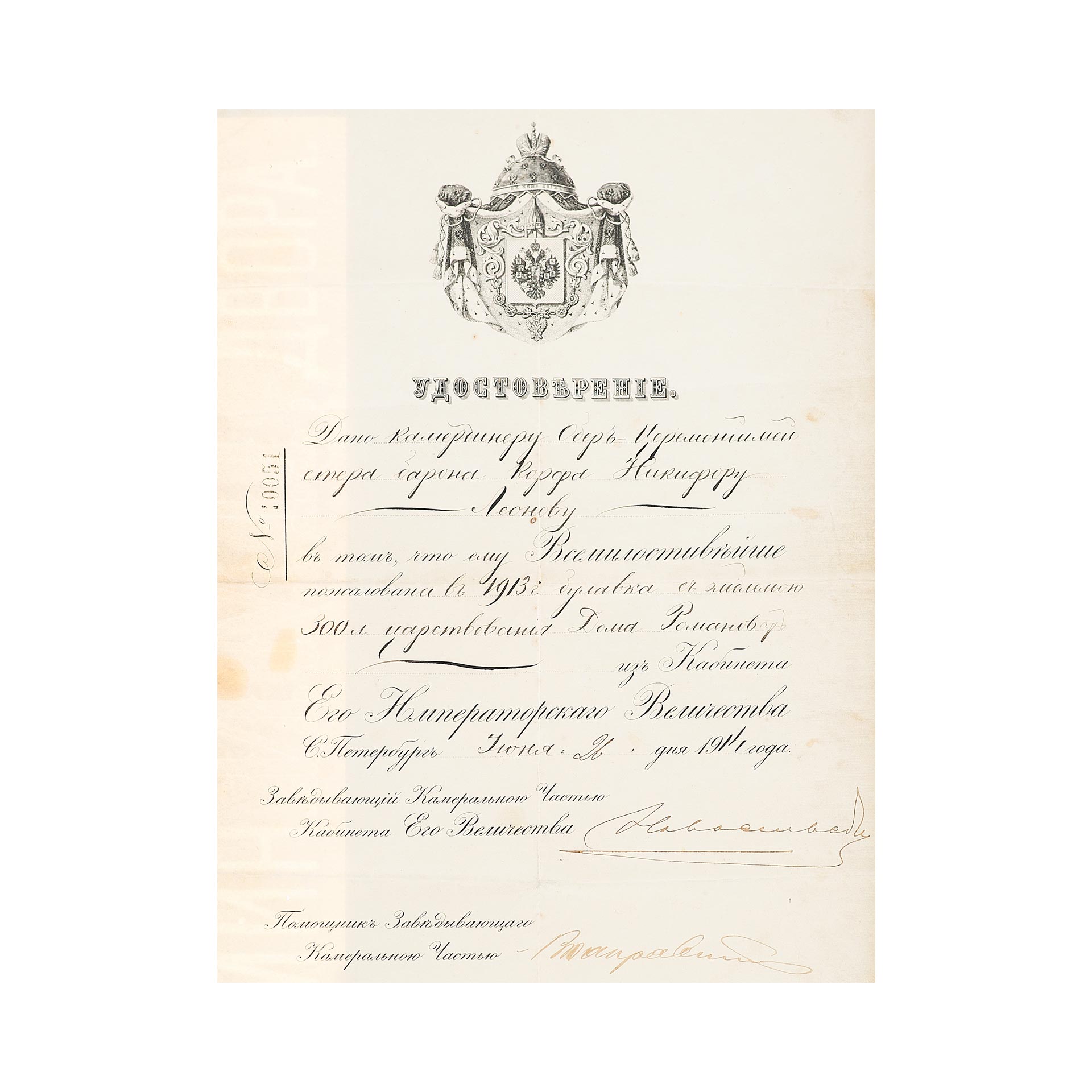 Типовое удостоверение, содержащее следующий текст: «Дано камердинеру обер-церемониймейстера барона Корфа Никифору Леонову в том, что ему Всемилостивейше пожалована в 1913г. булавка с эмблемой 300л царствования Дома Романовых из Кабинета Его Императорского Величества. С.Петербург июня 26 дня 1914г.».