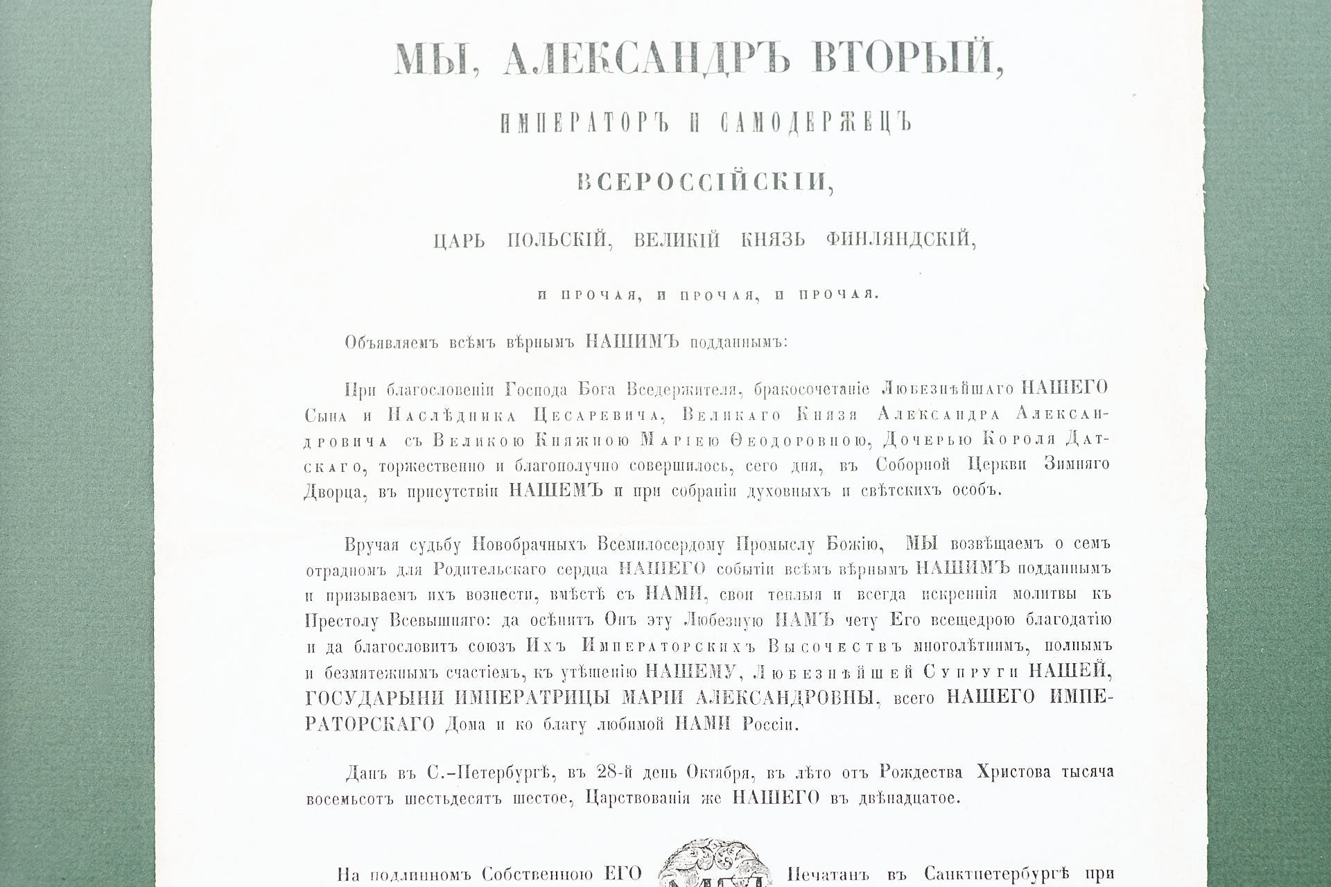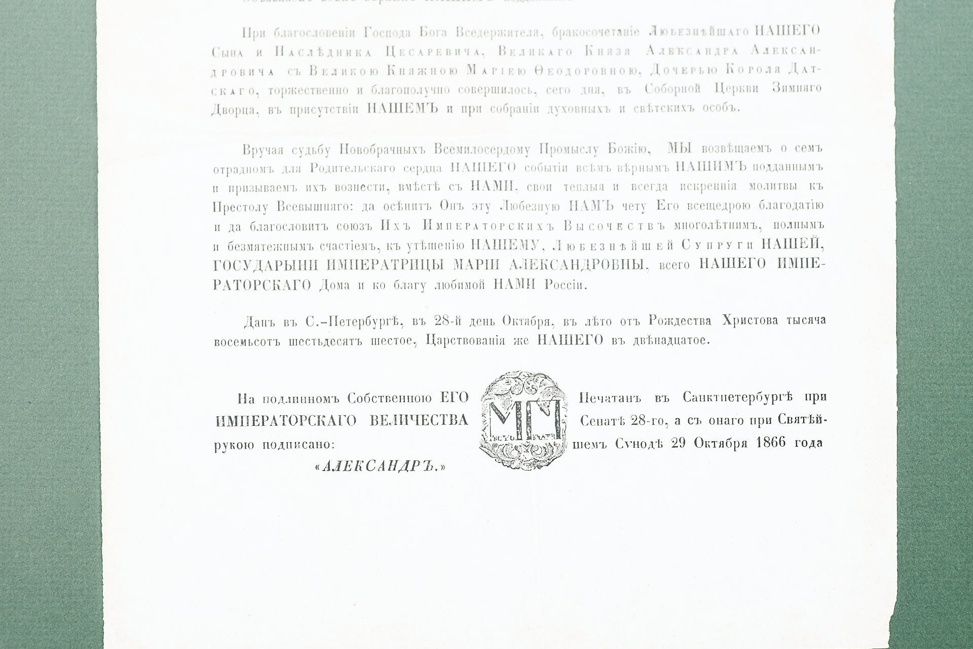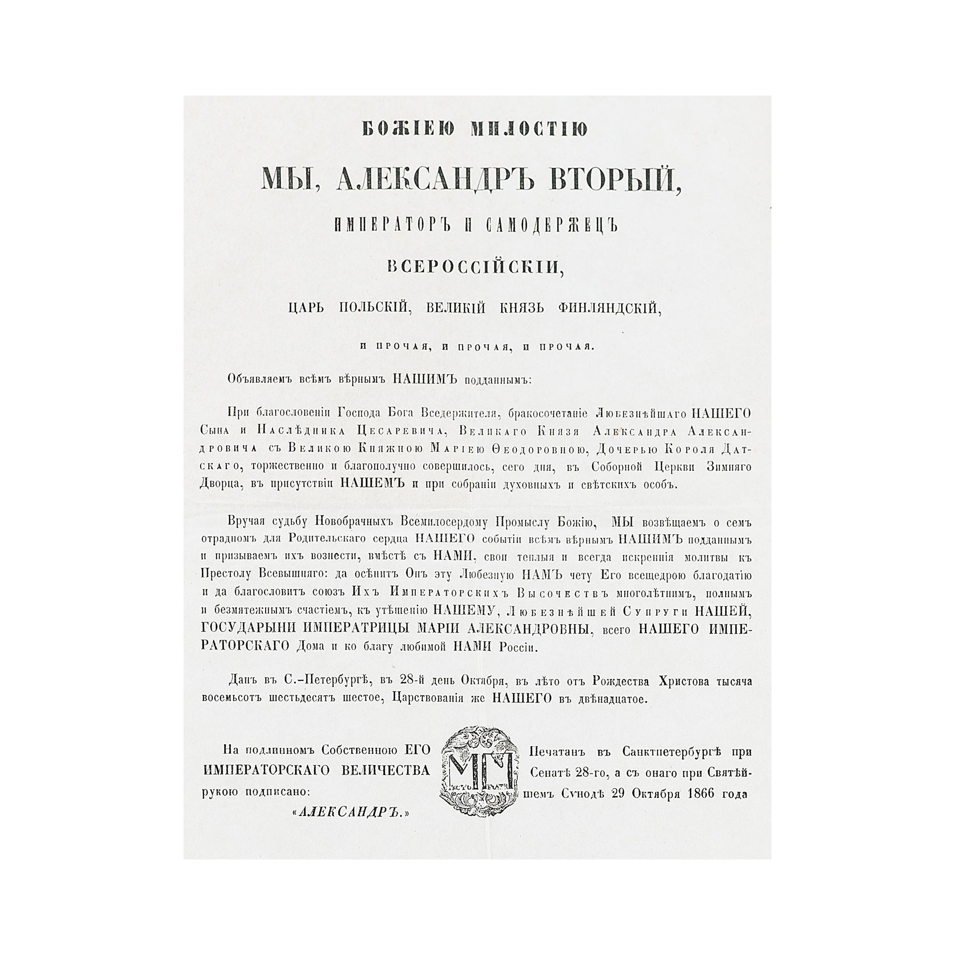 Манифест о бракосочетании князя Александра Александровича с княжной Марией Федоровной Российская империя 28-29 октября 1866