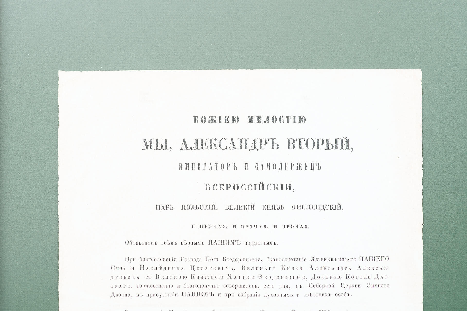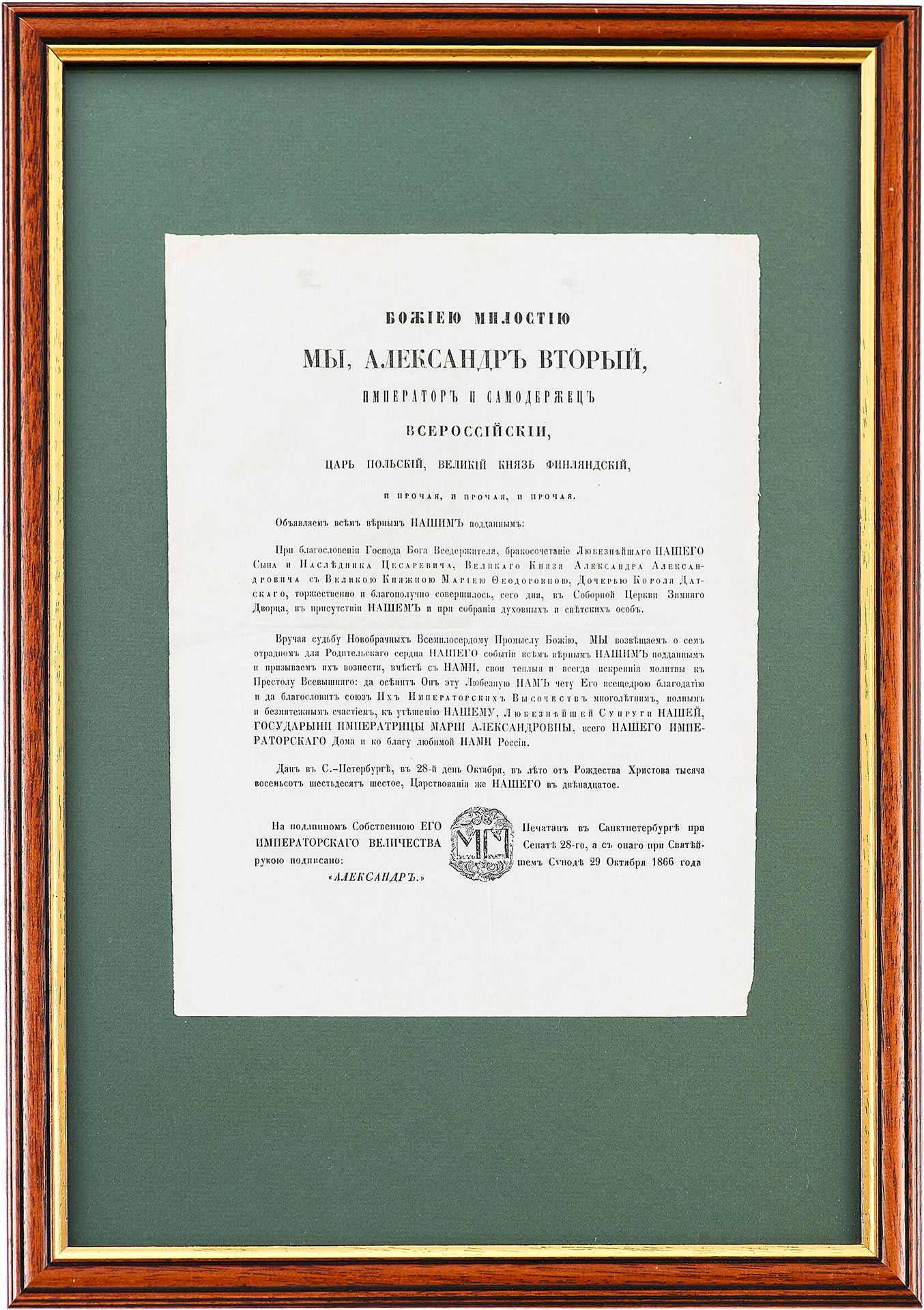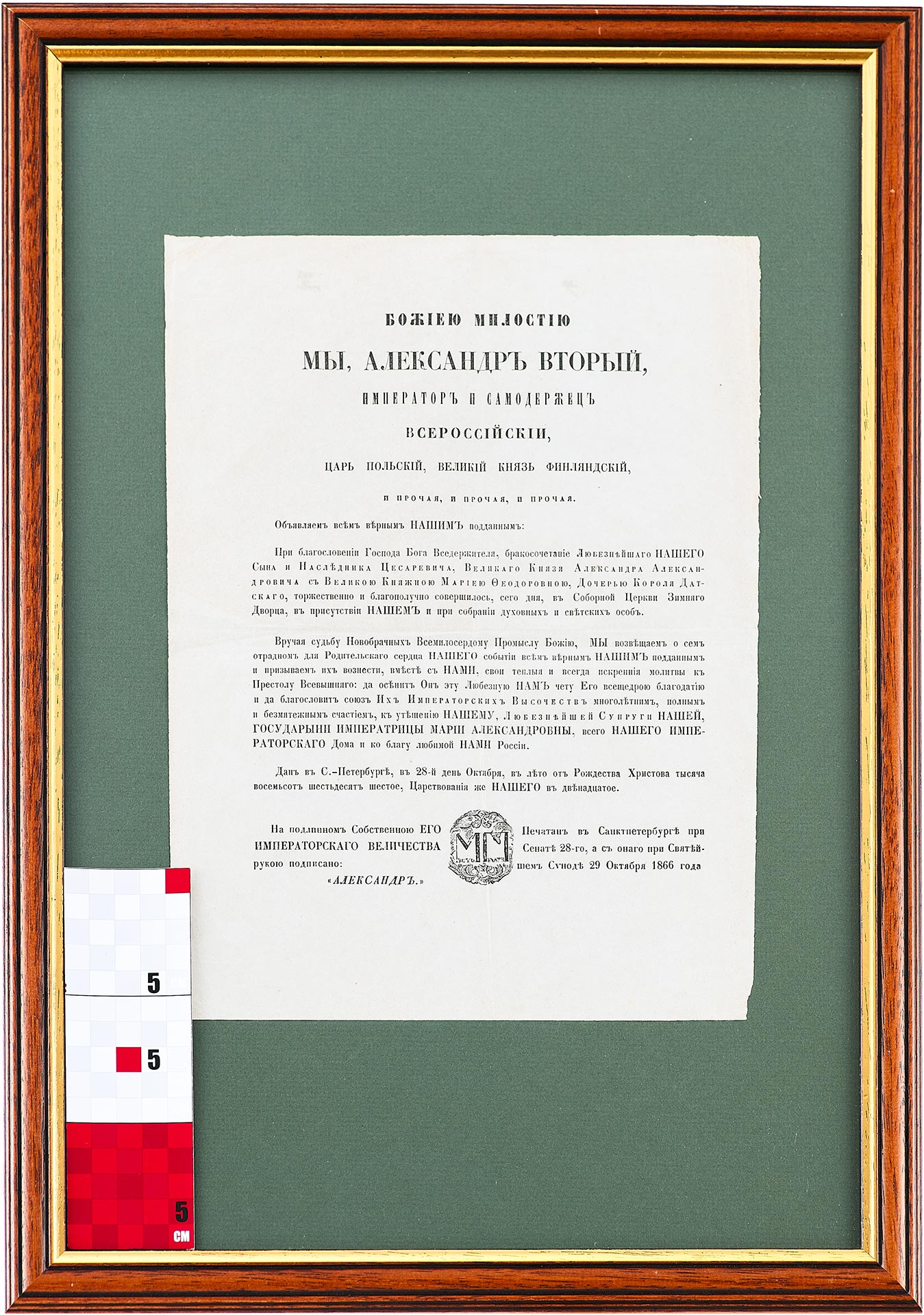 Манифест о бракосочетании князя Александра Александровича с княжной Марией Федоровной Российская империя 28-29 октября 1866