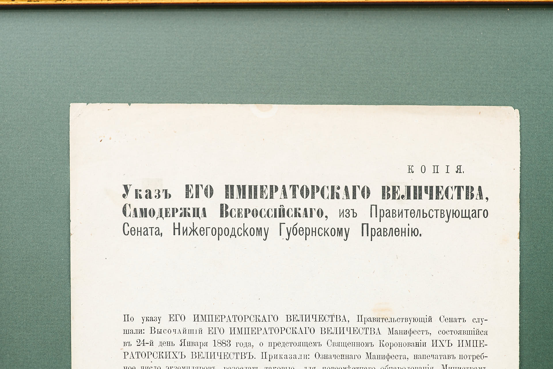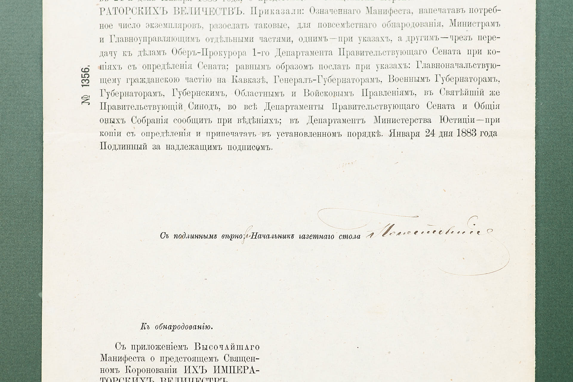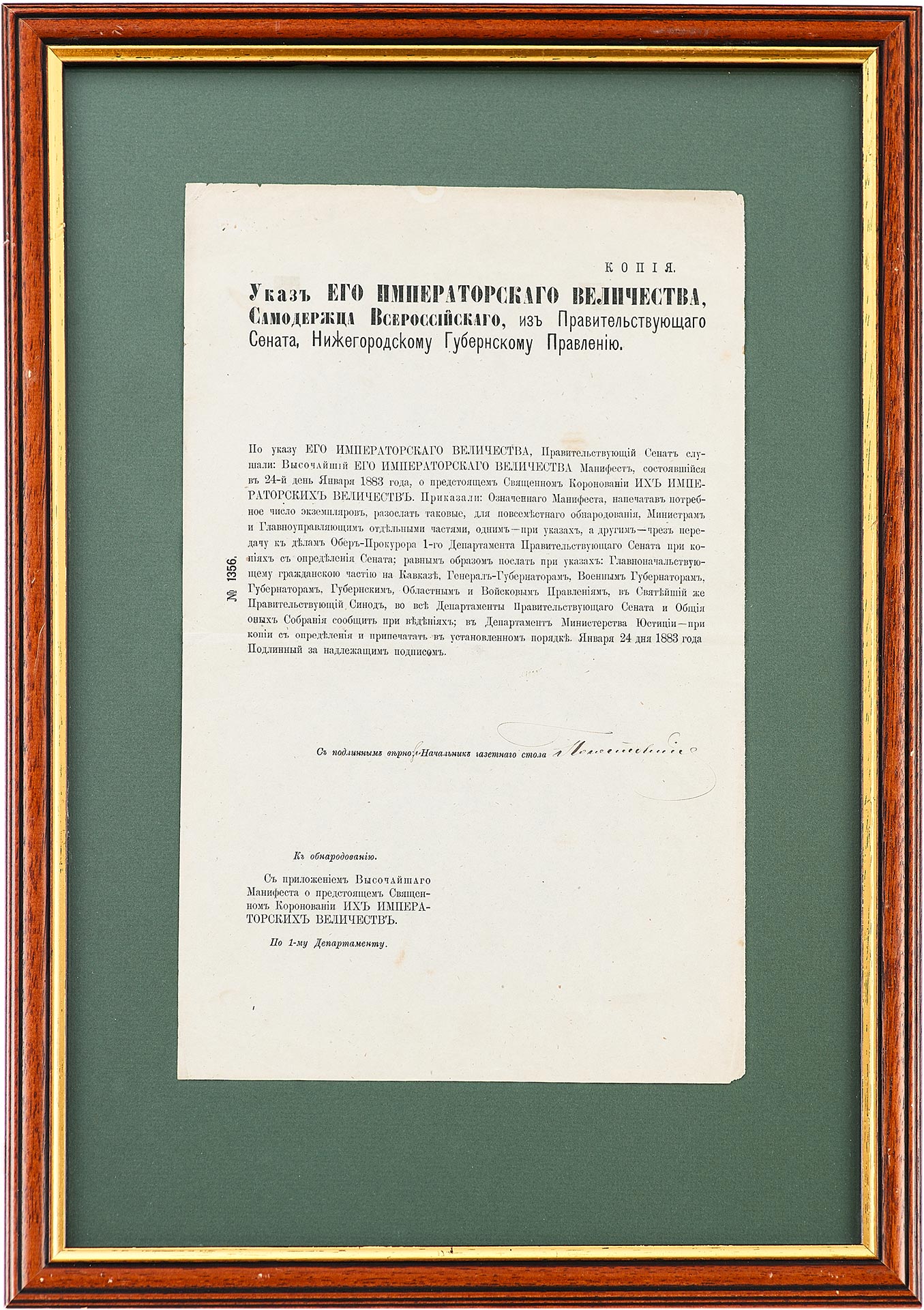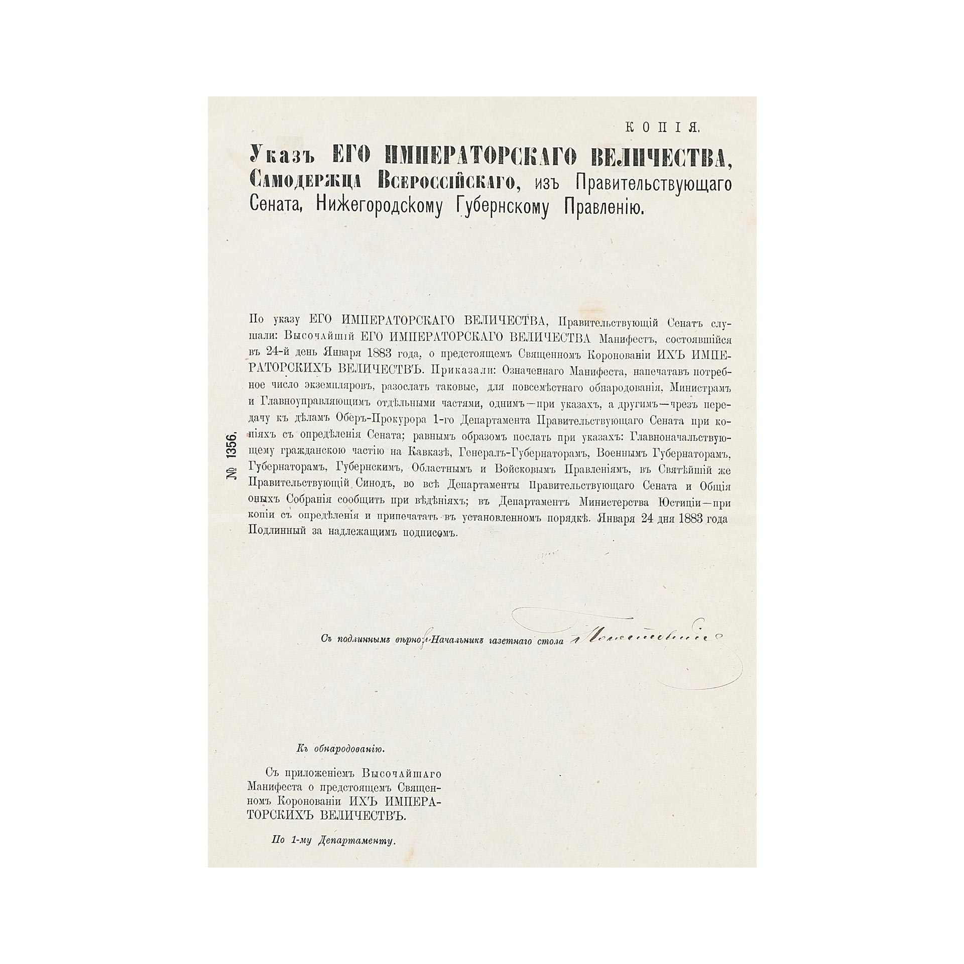Текст указа гласит: «По указу ЕГО ИМПЕРТОРСКОГО ВЕЛИЧЕСТВА, Правительствующій Сенатъслушали: Высочайшій ЕГО ИМПЕРТОРСКОГО ВЕЛИЧЕСТВА Манифестъ, состоявшійся в 24-й день Января 1883 года, о предстоящемъ священномъ короновании ИХЪ ИМПЕРТОРСКИХЪ ВЕЛИЧЕСТВЪ. Приказали Означеннаго Манифеста, напечатавъ потребное число экземпляровъ, разослать таковые, для повсеместнаго обнародованія, Министрамъ и Главноуправляющимъ отдельными частями, однимъ - при указах, а другимъ чрезъ передачу къ деламъ Оберъ-Прокурора 1-го Департамента Правительствующего Сената при копіяхъ съ определенія Сената; равным образомъ послать при указахъ: Главноначальствующему гражданскою частію на Кавказе, Генералъ-губернаторамъ, Военнымъ губернаторамъ, Губернаторамъ, Губернскимъ и Областнымъ и Войсквымъ Правленіям, въ Святейшій же Правительствующий Синод, во все Департаменты Правительствующаго Сената и Общія оных собрания сообщить при веденияхъ: Въ Департаментъ