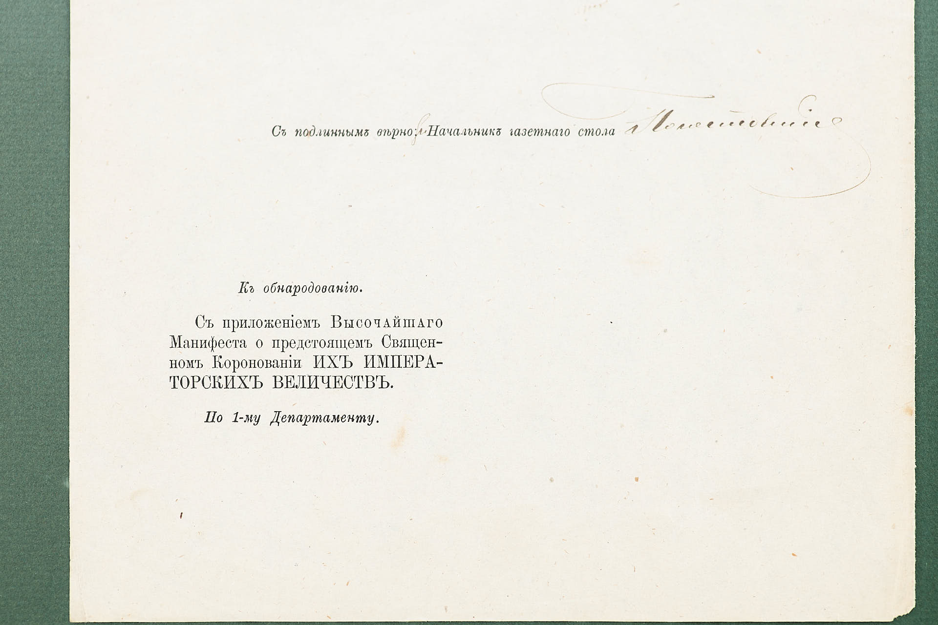 Съ подтиннымъ верное Начальник газетнаго стола Поляст.... (?)Къ обнародовванию. Съ приложеніемъ Высочайшаго