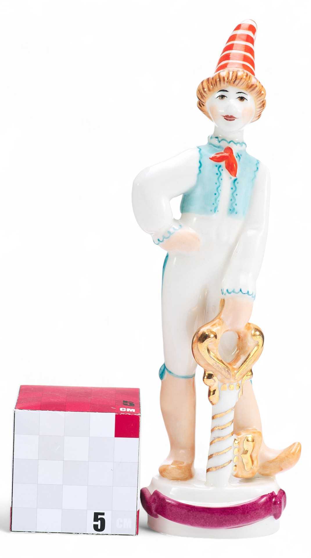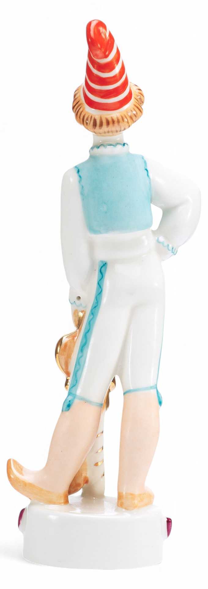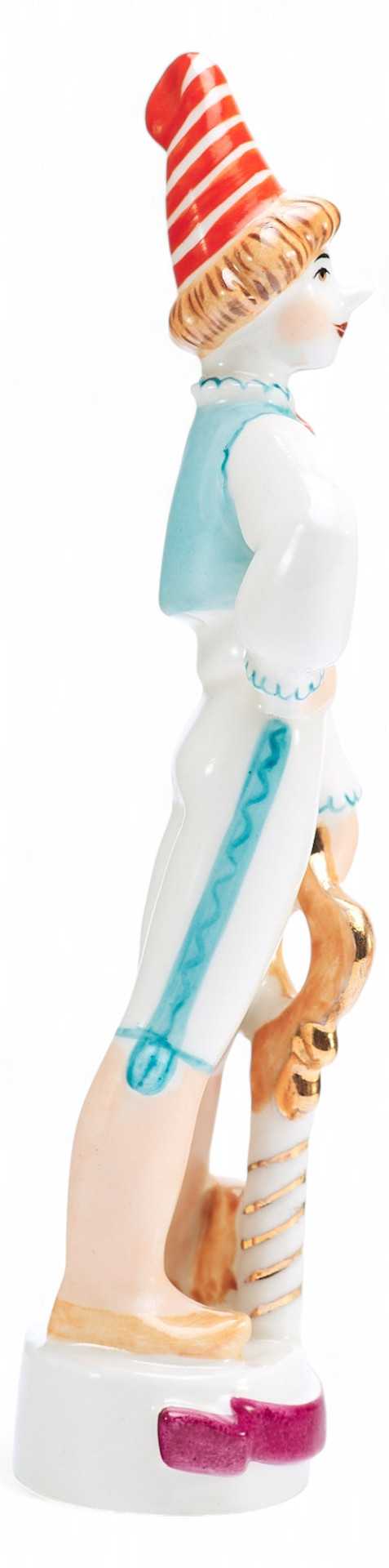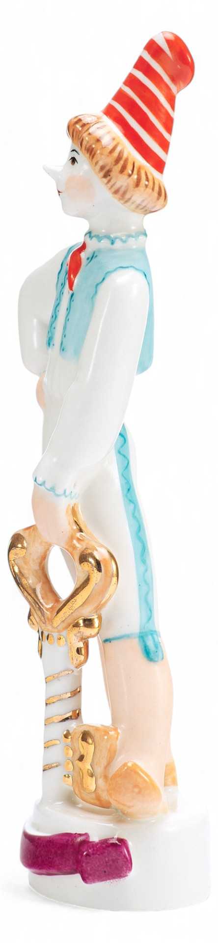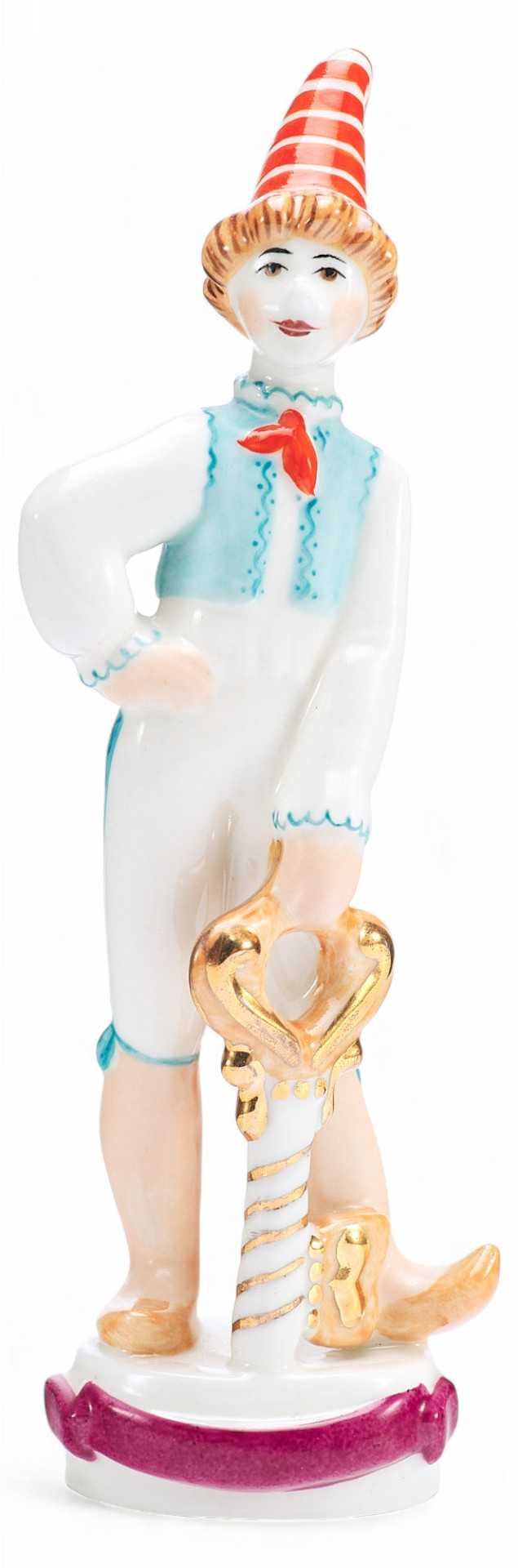 Фарфоровая скульптура "Буратино" по повести А.И.Толстого «Золотой ключик», автор В.И. Щербина. На основании синее клеймо «К» и «MADE IN USSR» (или знак качества СССР), для экспорта, бывшее в употреблении с 1976 по 1991 гг.