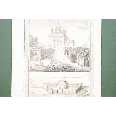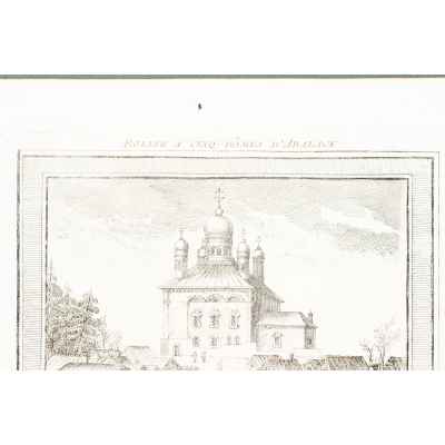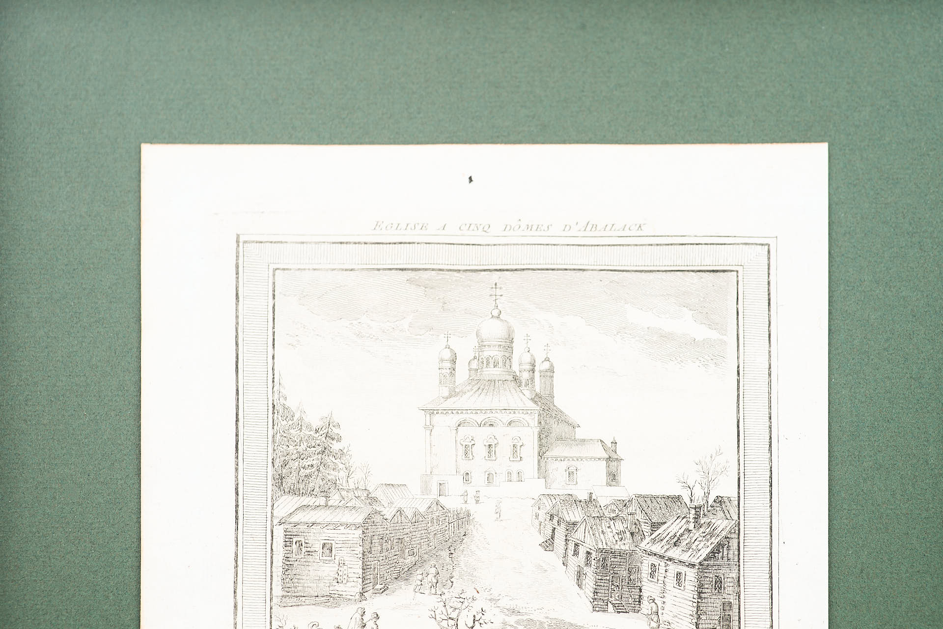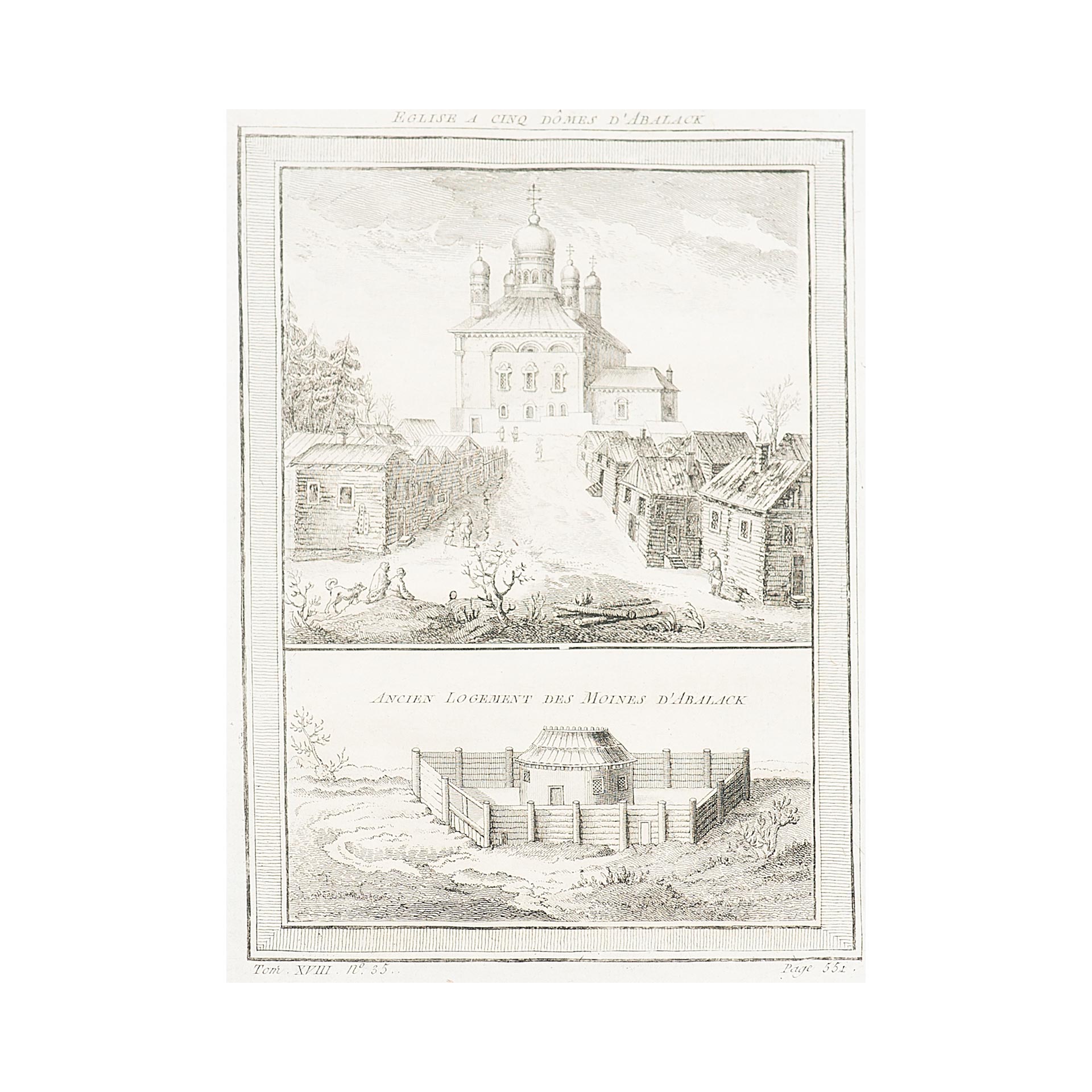 Гравюра состоит из двух частей. На верхней изображена пятиглавая церковь и Знаменский монастырь, окруженный жилыми постройками. Подпись на французском языке гласит: «Eglise à Cinq Dôme d'Abalack» («Церковь о пяти куполах в Абалаке»).
